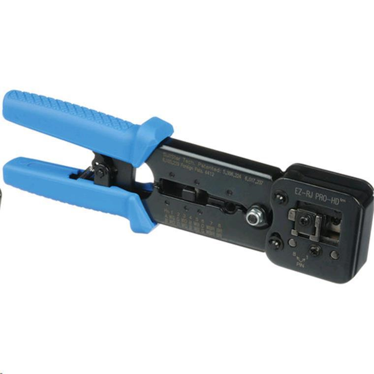 Designed for telecommunications, information technology, and security professionals, the EZ-RJPRO HD Crimp Tool from Platinum Tools allows for easy installation of Cat 5/5e and Cat 6 connectors. This tool delivers consistent, reliable, and repeatable terminations, even when working with larger outer diameter cables. All the blades are user-replaceable, for a long service life. Proper use assures that every termination will meet FCC specifications.