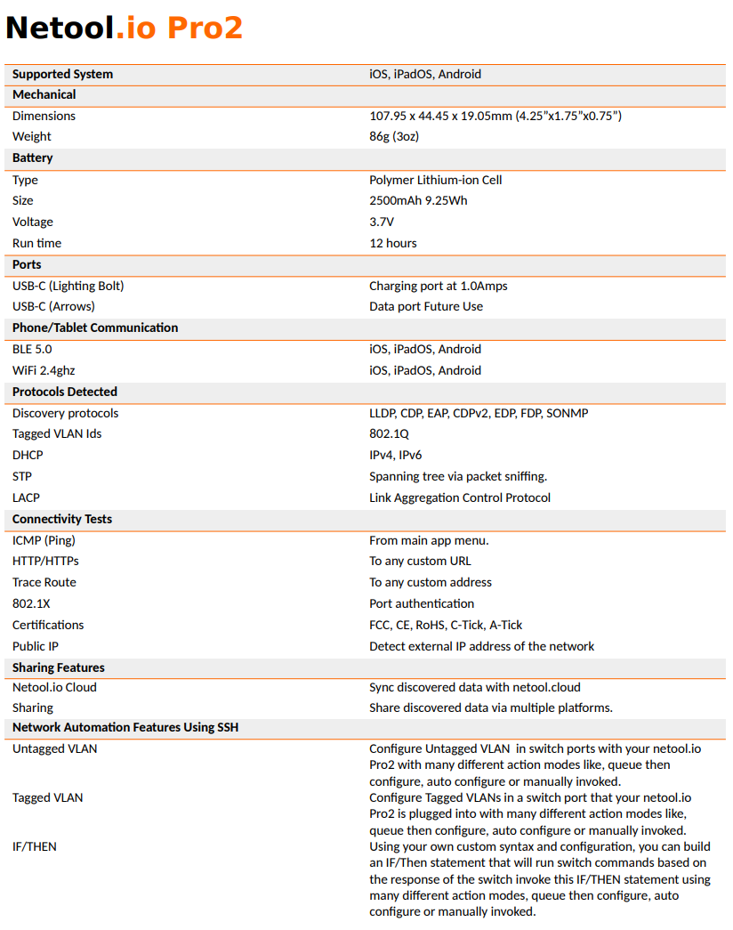 The Netool.io Pro2 is a versatile network diagnostic tool compatible with iOS, iPadOS, and Android systems. It features USB-C ports for charging at 1.0 Amps and data use for future applications. Communication with phones and tablets is supported via BLE 5.0 and Wi-Fi 2.4 GHz. It detects protocols including LLDP, CDP, EAP, CDPv2, EDP, FDP, SONMP, and tagged VLAN IDs 802.1Q. It supports DHCP (IPv4 and IPv6), spanning tree detection through packet sniffing, and LACP. Connectivity tests include ICMP ping, HTTP/HTTPS, trace route, and 802.1X port authentication. It is FCC, CE, RoHS, C-Tick, and A-Tick certified and can detect the public IP address of a network.