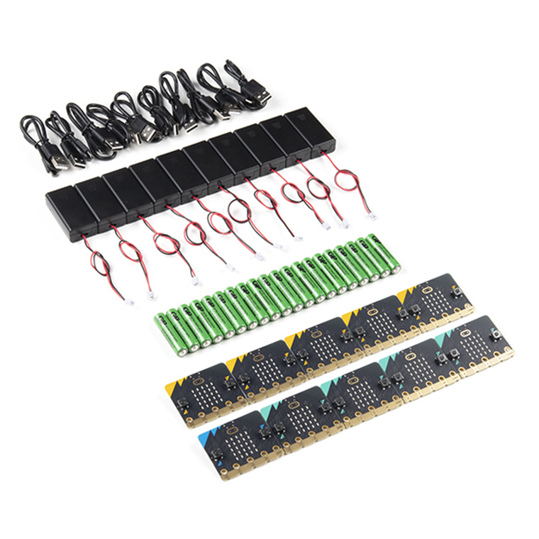 This micro:bit v2 Club Kit contains ten, count em', ten micro:bit v2 Go Bundles that provides you with everything you need to get hooked up and powered. This kit includes the micro:bit v2, a short USB cable, a AAA battery holder and AAA batteries. Also inside the Go Bundle you will find a Quick Start Guide with four unique ideas to get you started with micro:bit! The Go Bundle is a quick and economical way to get started with the micro:bit. So gather up your crew, give your club a cool name & get programming!