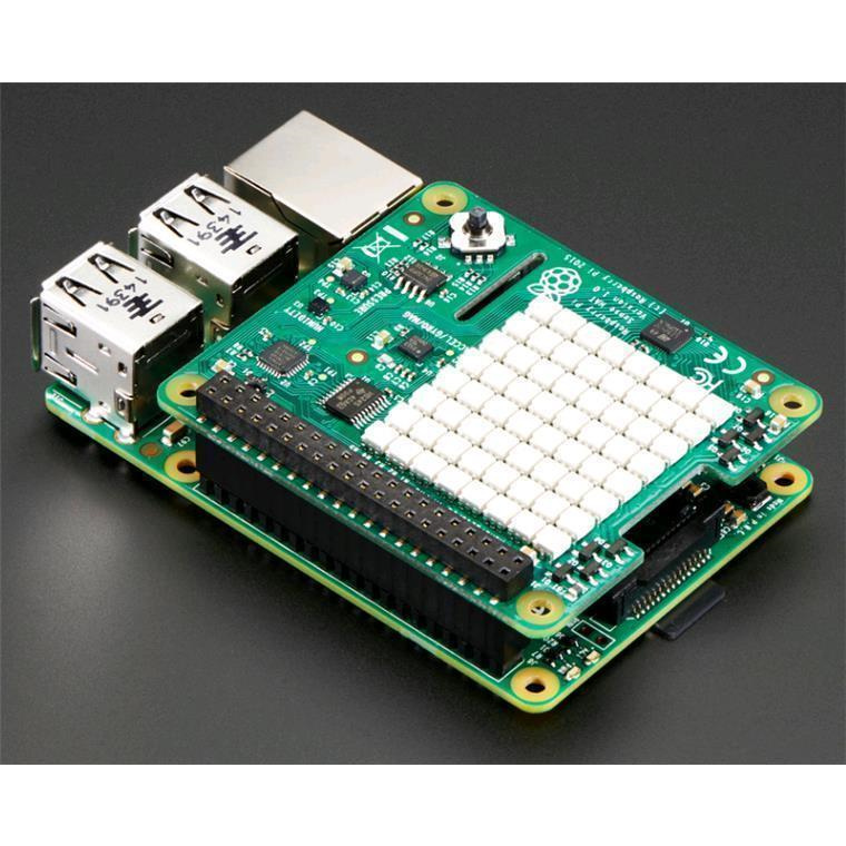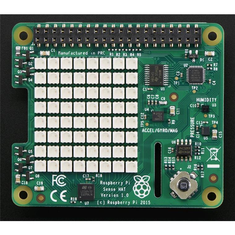 The Raspberry Pi Sense HAT is attached on top of the Raspberry Pi via the 40 GPIO pins. The Sense HAT has several integrated circuit based sensors that can be used for many different types of experiments, applications, and even games.