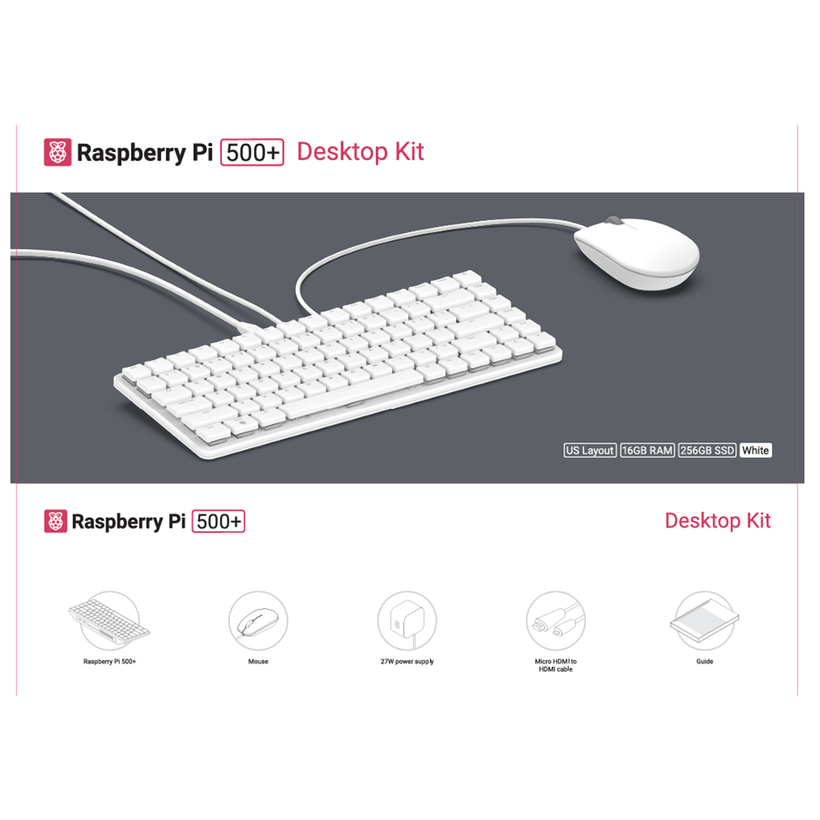 The Raspberry Pi 500+ Desktop Kit provides everything you need for a full Raspberry Pi 500+ setup - just add a monitor! Comes with a Raspberry Pi 500+, mouse, USB-C power supply, HDMI cable and the Official Raspberry Pi Beginner's Guide.