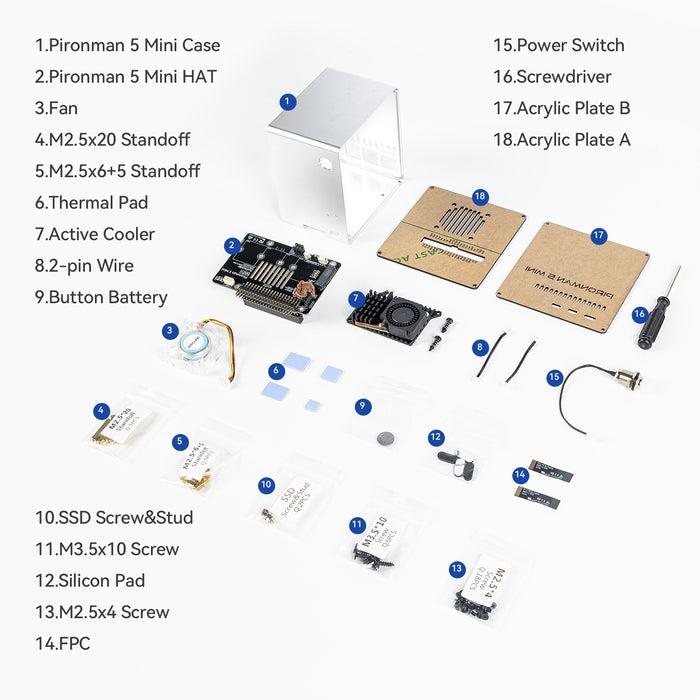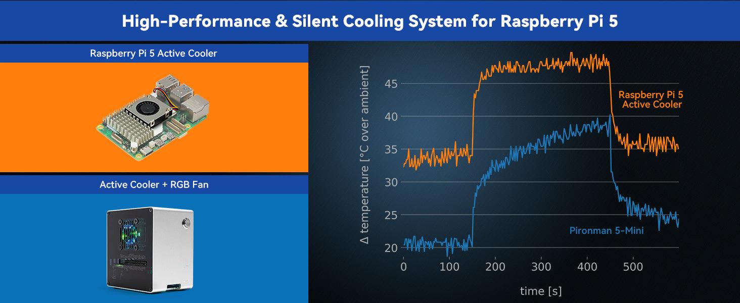 - Advanced Cooling System: Keep your Raspberry Pi 5 cool and stylish with Pironman 5-Mini's PWM active cooler and RGB fan. Designed for long-lasting performance, it efficiently dissipates heat under heavy loads, keeps fan noise low, and provides excellent ventilation to cool both the Raspberry Pi 5 and NVMe SSD or Hailo-8L AI accelerator