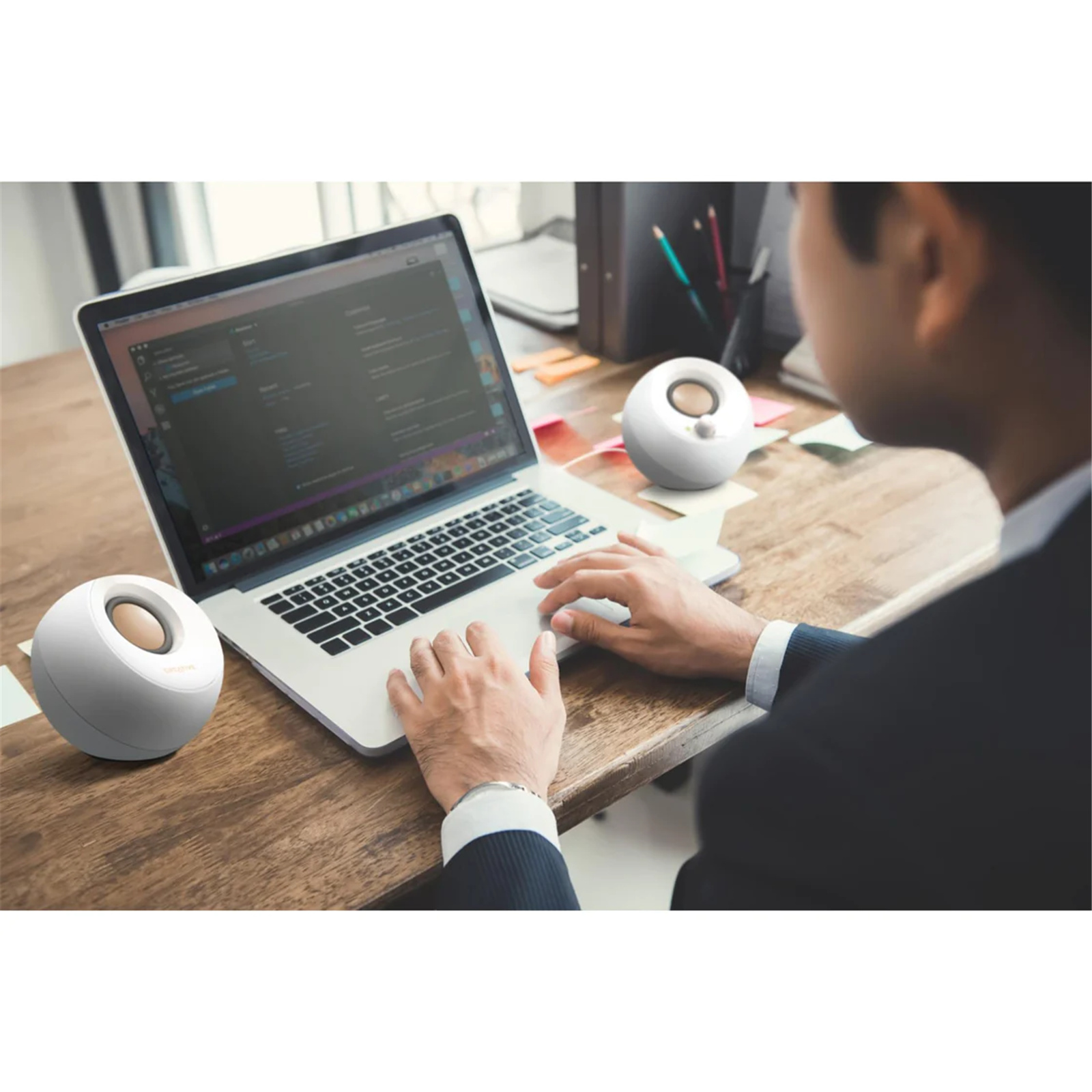 Inspired by the zen Japanese rock garden, the orb-shaped Creative Pebble is a sleek and elegant 2.0 speaker system that looks perfect in any home and office. It features a 45° elevated sound stage for enhanced audio projection and is powered by a single USB cable for hassle-free music entertainment.