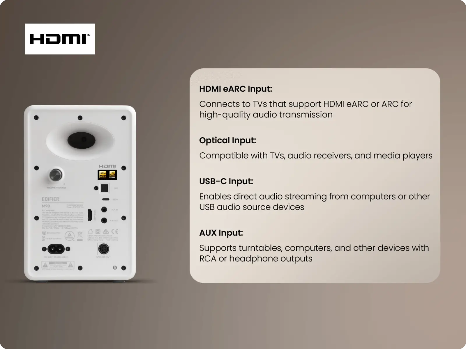 The EDIFIER M90 is a compact active speaker designed for high-resolution audio reproduction. With impressive power output and versatile connectivity, it's an ideal companion for desktops, bookshelves, and TV setups.