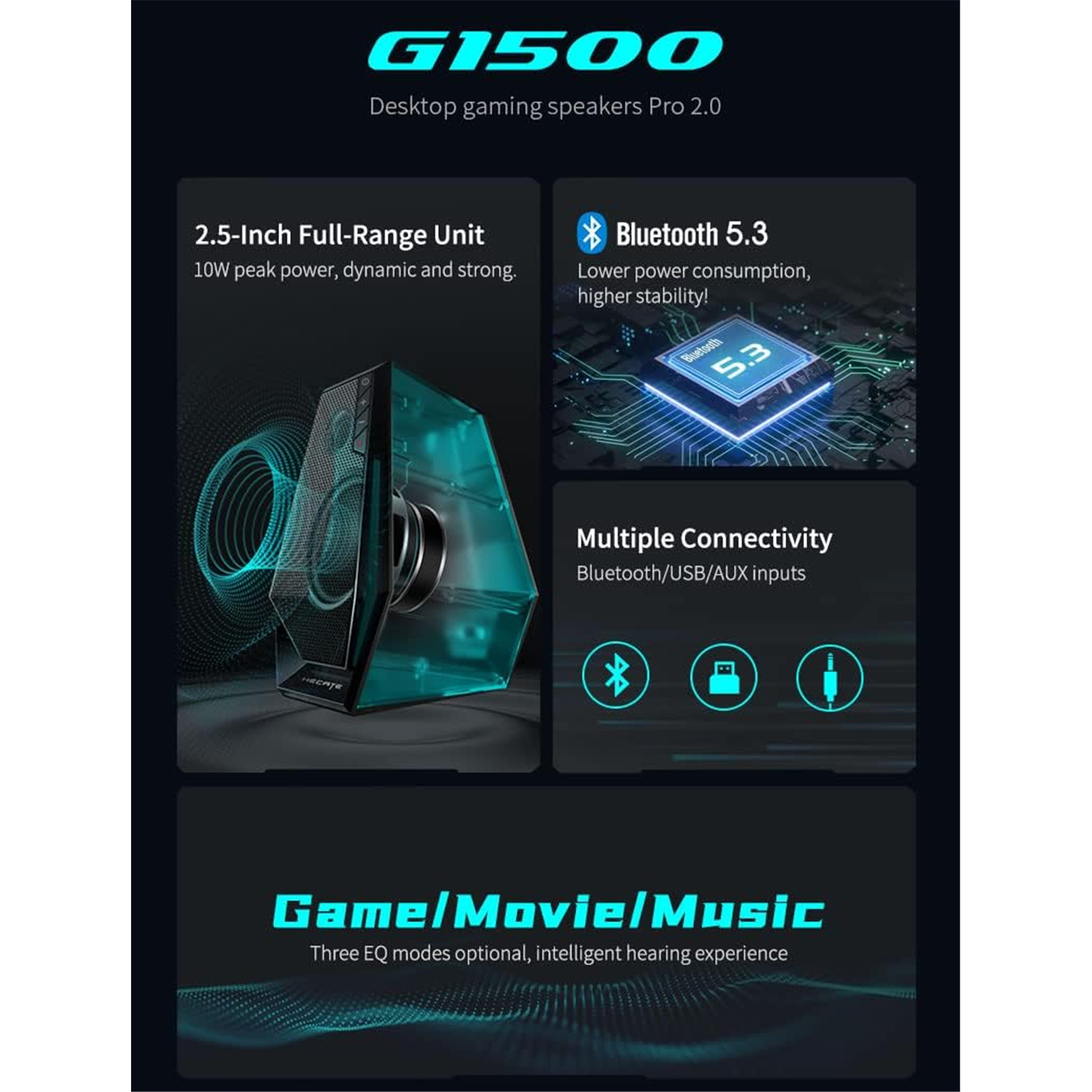 Edifier G1500 RGB Desktop PC Gaming Speakers with Bluetooth 5.3 - Black USB-A + 3.5mm AUX + Bluetooth inputs - Game / Music / Movie EQs - 2.5" full-range drivers - RGB LED light effects