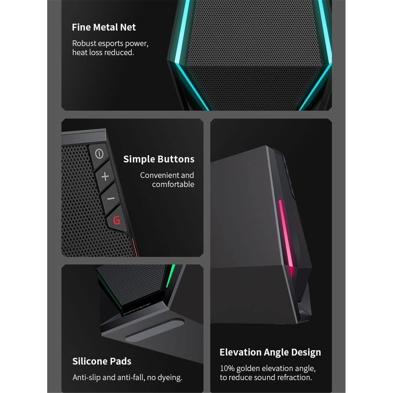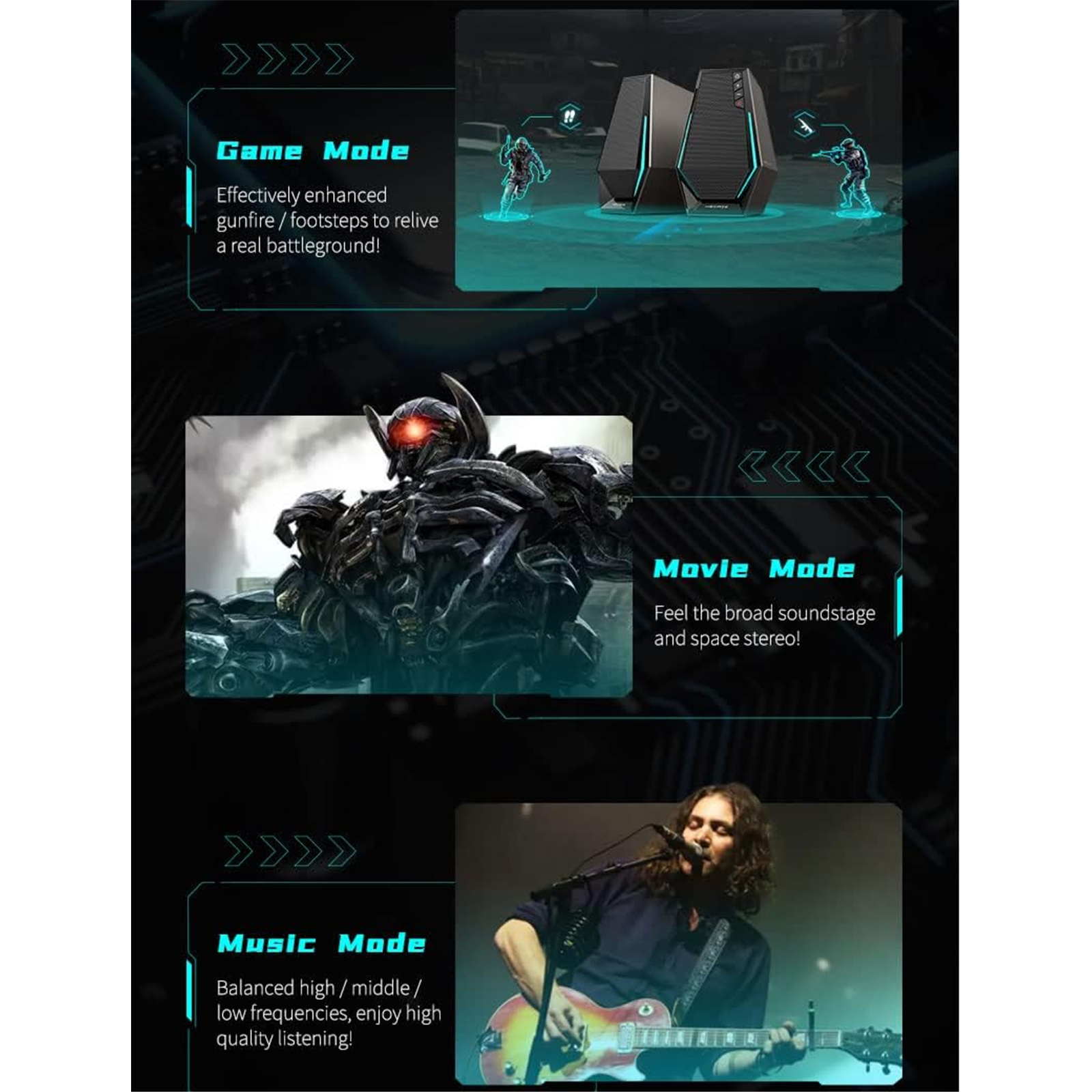 USB-A + 3.5mm AUX + Bluetooth inputs - Game / Music / Movie EQs - 2.5" full-range drivers - RGB LED light effects