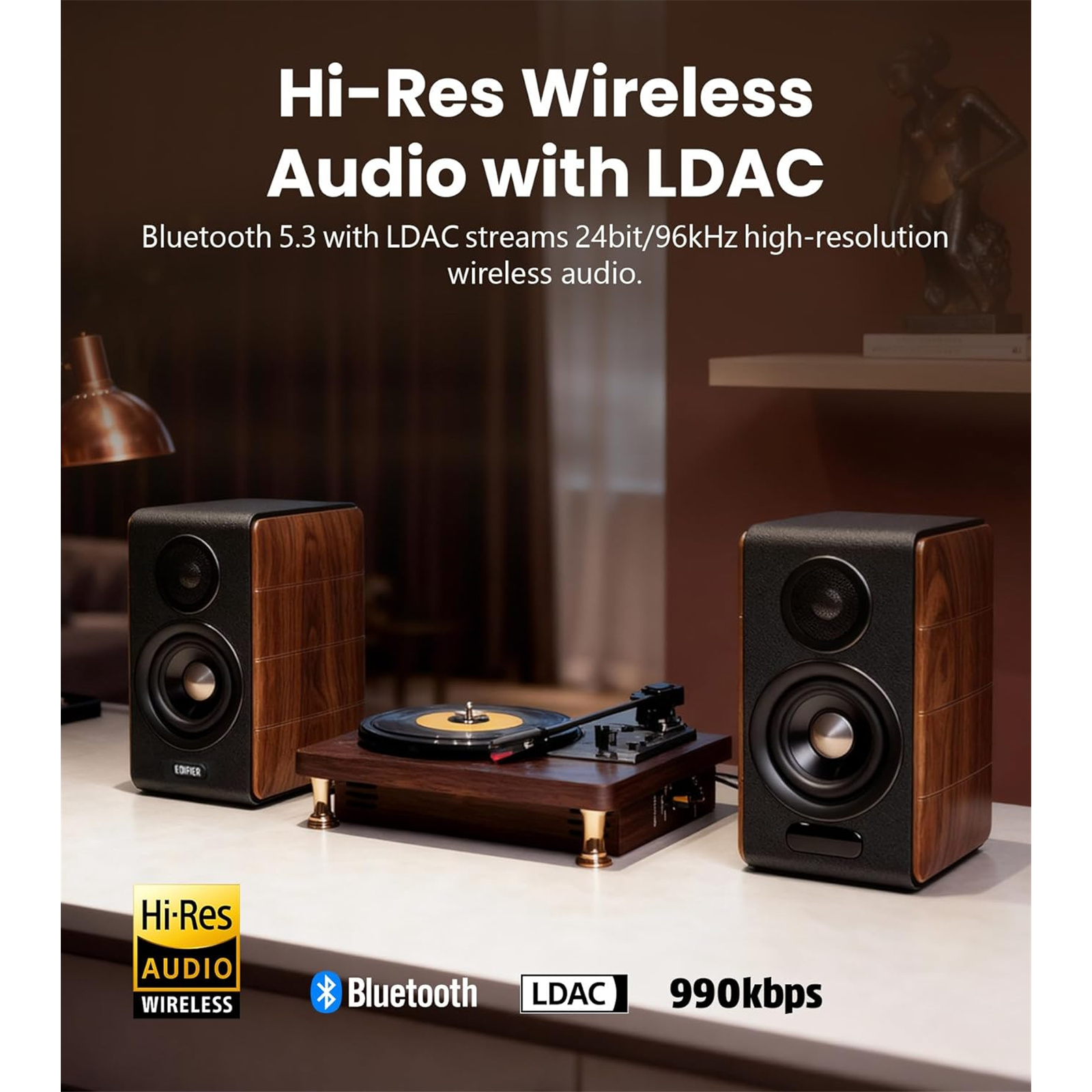 The Bluetooth 5.3 audio receiver supports LDAC codec at transmission rates up to 990kbps, enabling high-resolution wireless audio streaming at up to 24bit/96kHz from Android devices (Android 8.0 and later).