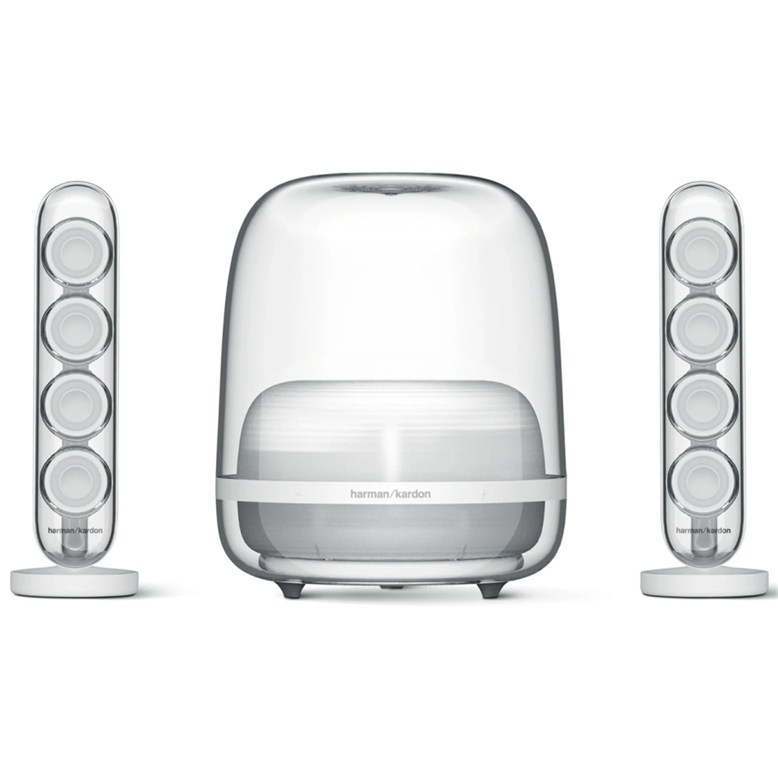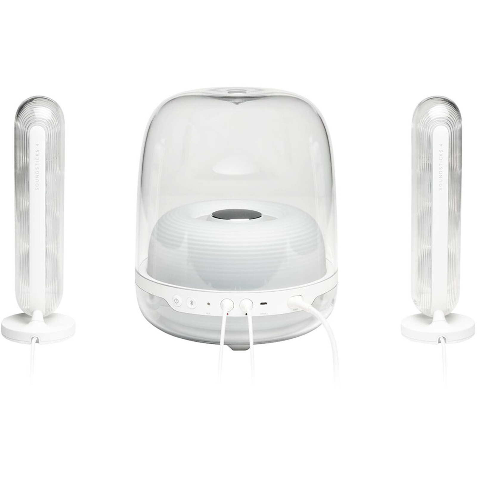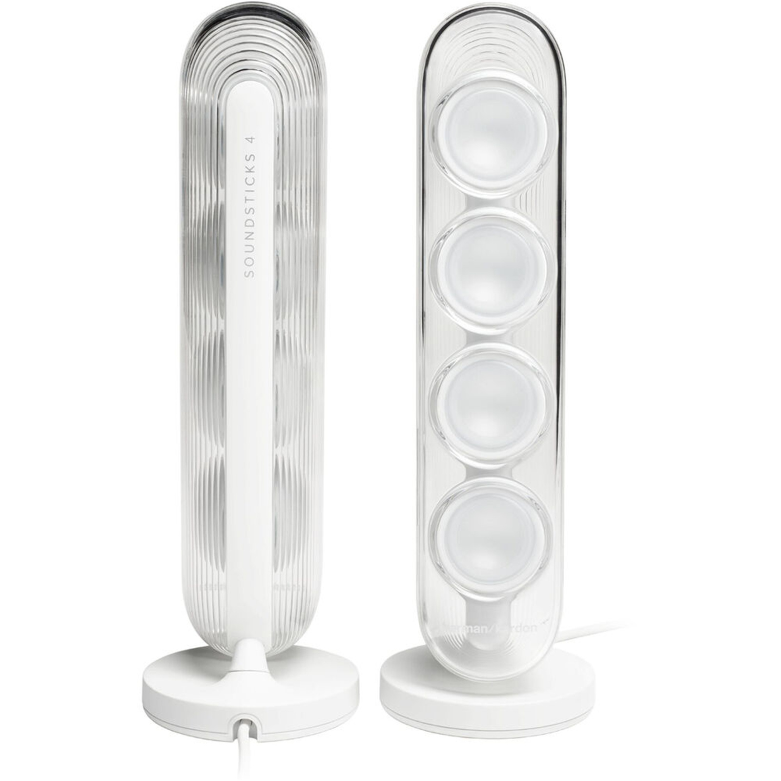 Welcome a timeless icon into your home with Harman Kardon SoundSticks 4. Extraordinary sound meets sculptural design in this one-of-a-kind audio masterpiece from the legendary Harman Kardon brand. Bring harmony into your living space with unparalleled sound quality and beautiful transparent materials. Highly regarded as a true work of art by passionate audio enthusiasts around the globe, Harman Kardon SoundSticks 4 is a stunning system that fills your space with vibrant treble and incredible bass. Transform the look and sound of your life and experience music in a new, exceptional way.