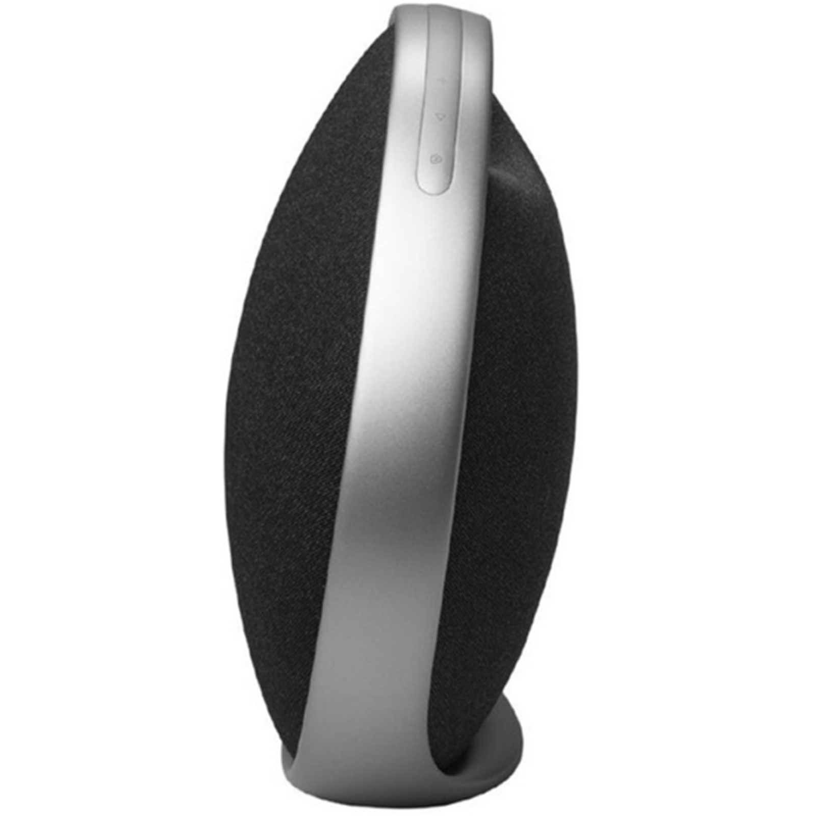 The Harman Kardon Onyx Studio 9 has a clean, circular design that looks great everywhere. The integrated aluminum frame doubles as a sturdy handle and stand, the soft but durable fabric looks sharp and feels nice, while the easy-to-use silicon buttons on top give you quick control.