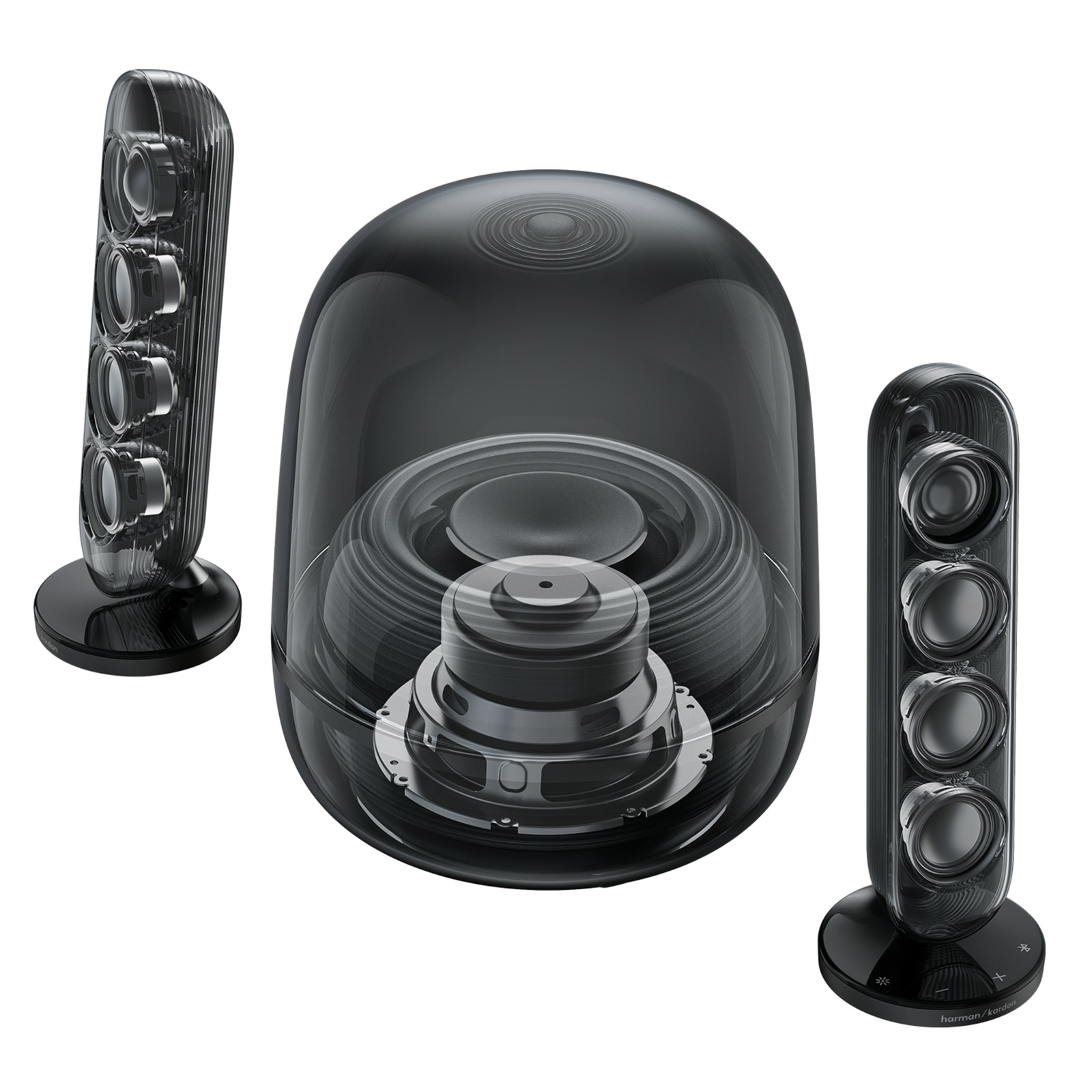 SoundSticks 5 elevates the iconic SoundSticks design with a fully transparent dome in your choice of stylish hues, highlighted with premium metallic accents. The uplifted subwoofer adds a refined visual element, while thoughtful features like the streamlined connectivity island and intuitive touch controls on the base of the right speaker keep things simple and easy to use.