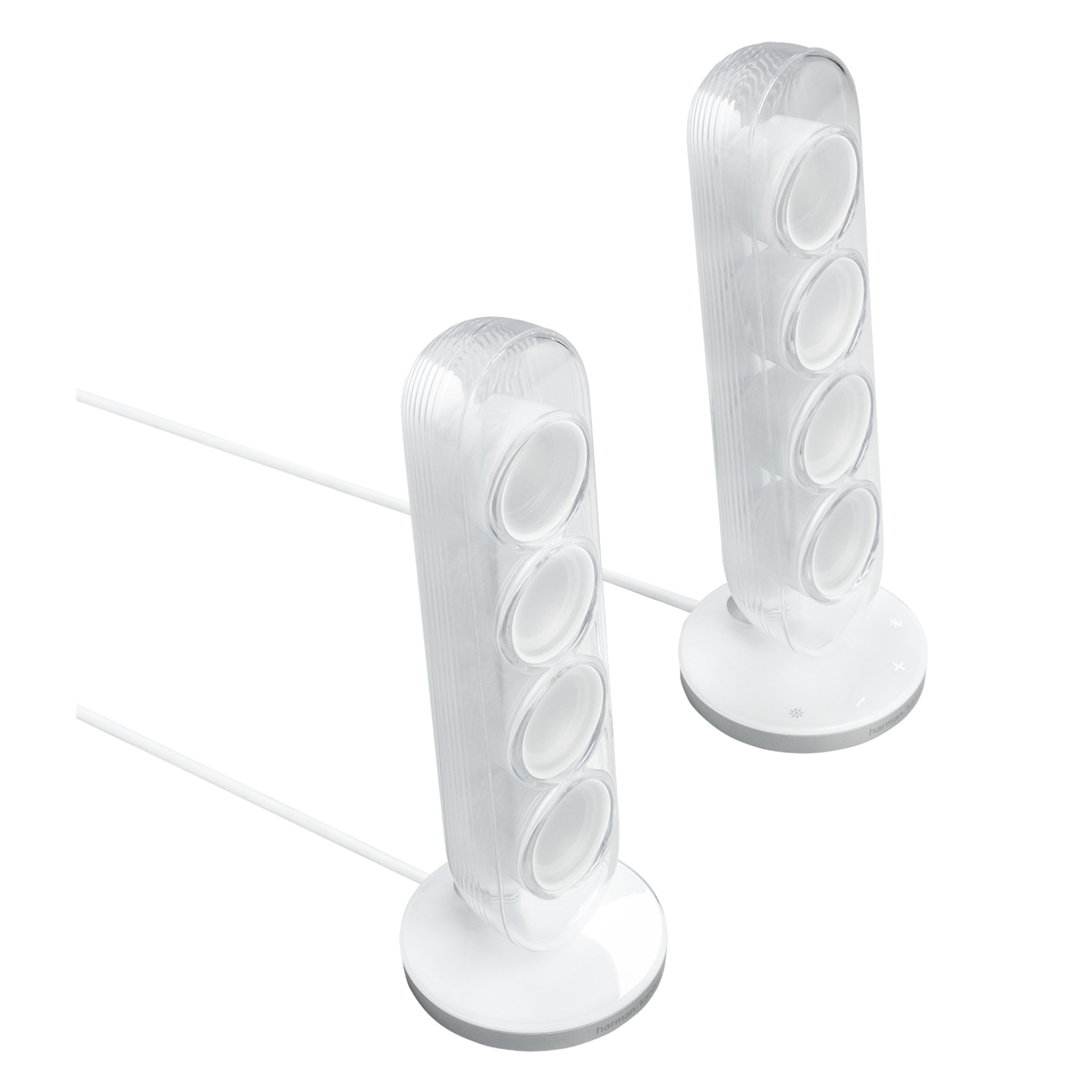 SoundSticks 5 elevates the iconic SoundSticks design with a fully transparent dome in your choice of stylish hues, highlighted with premium metallic accents. The uplifted subwoofer adds a refined visual element, while thoughtful features like the streamlined connectivity island and intuitive touch controls on the base of the right speaker keep things simple and easy to use.
