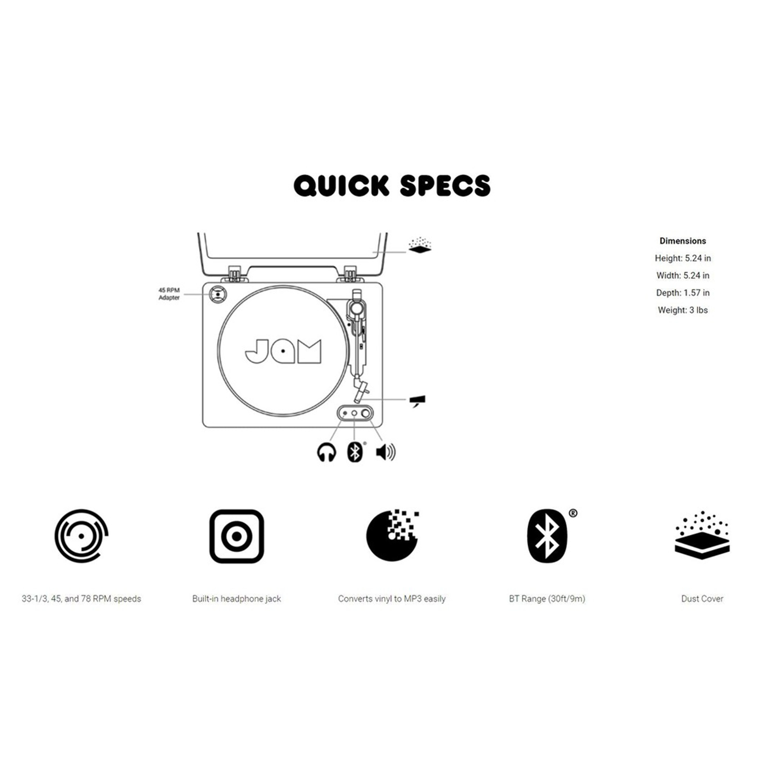 Jam Audio Spun Out Wireless Turntable Vinyl Record Player with Built-in Pre-Amp - USB + Bluetooth + RCA + 3.5mm Connectivity