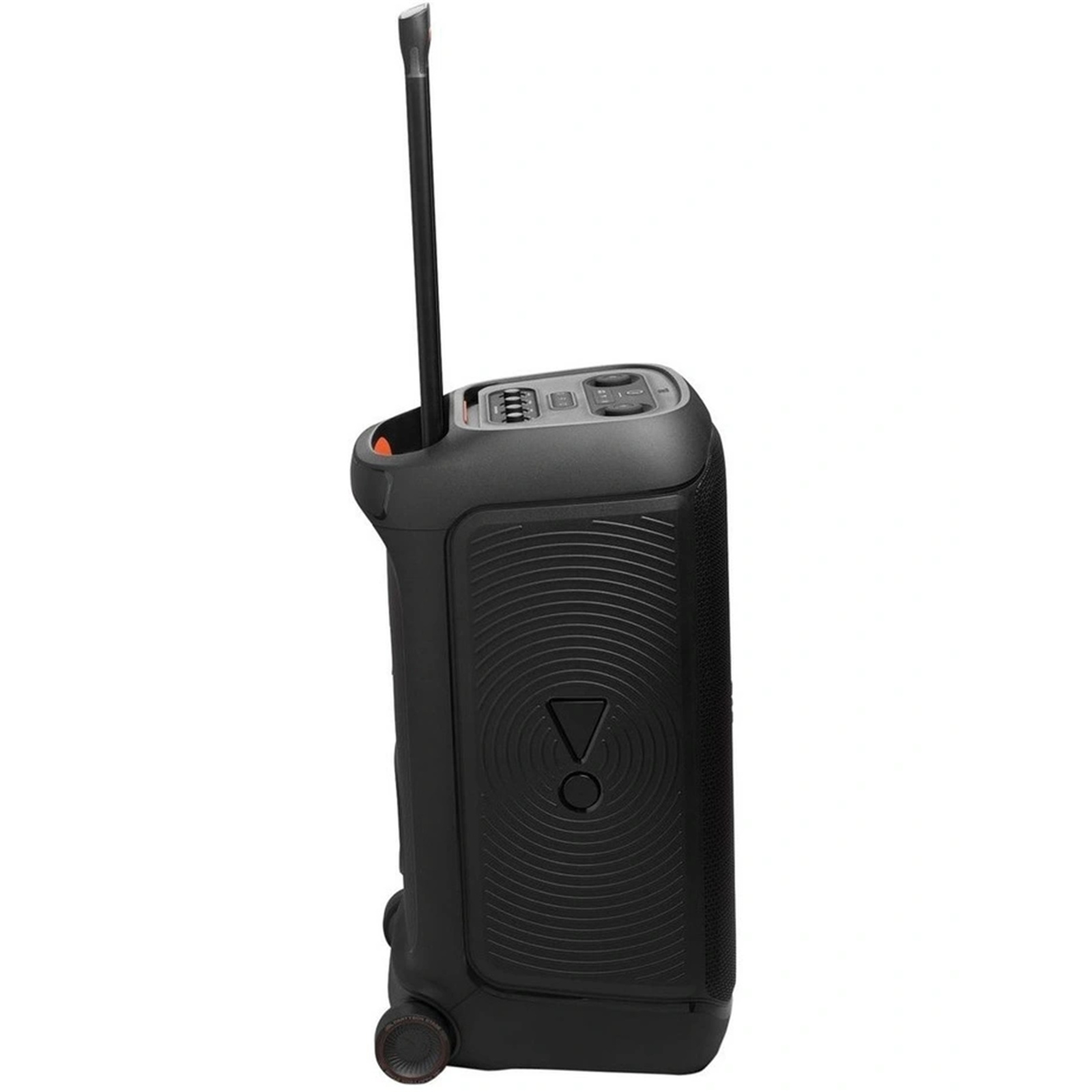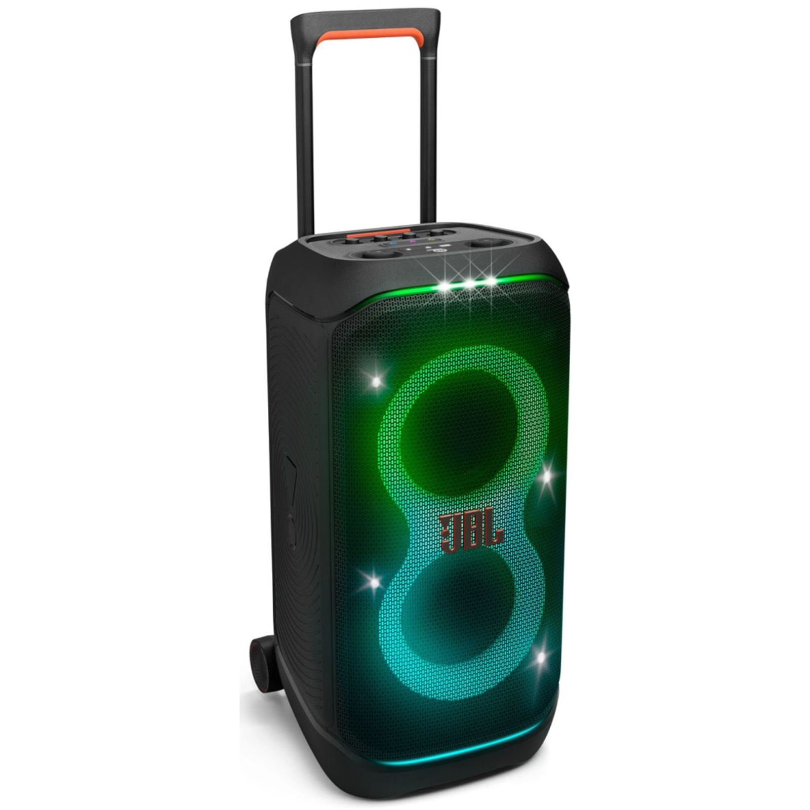 Portable party speaker with powerful JBL Pro Sound, an adaptive lightshow, splashproof, replaceable battery, telescopic handle and wheels.