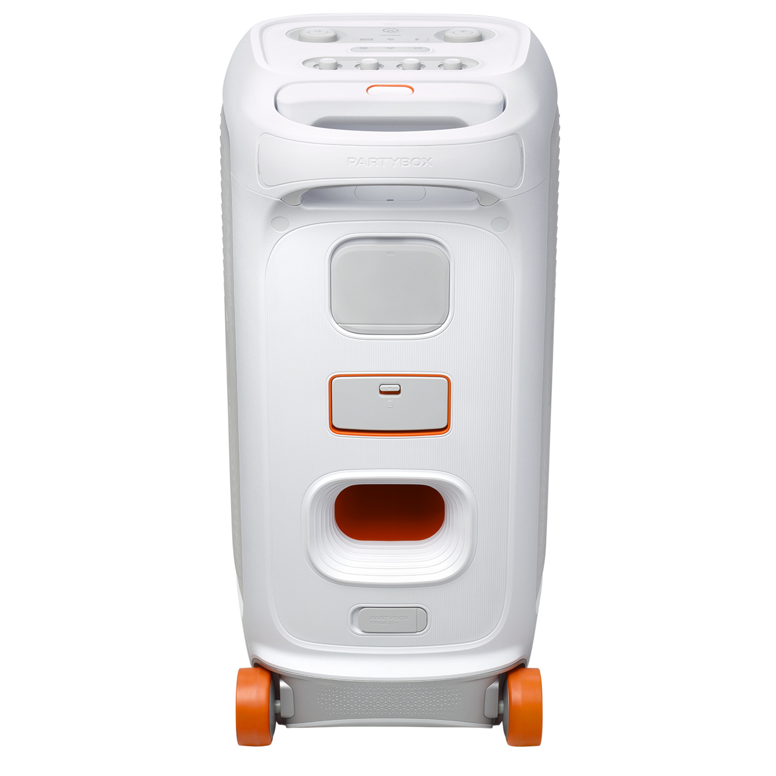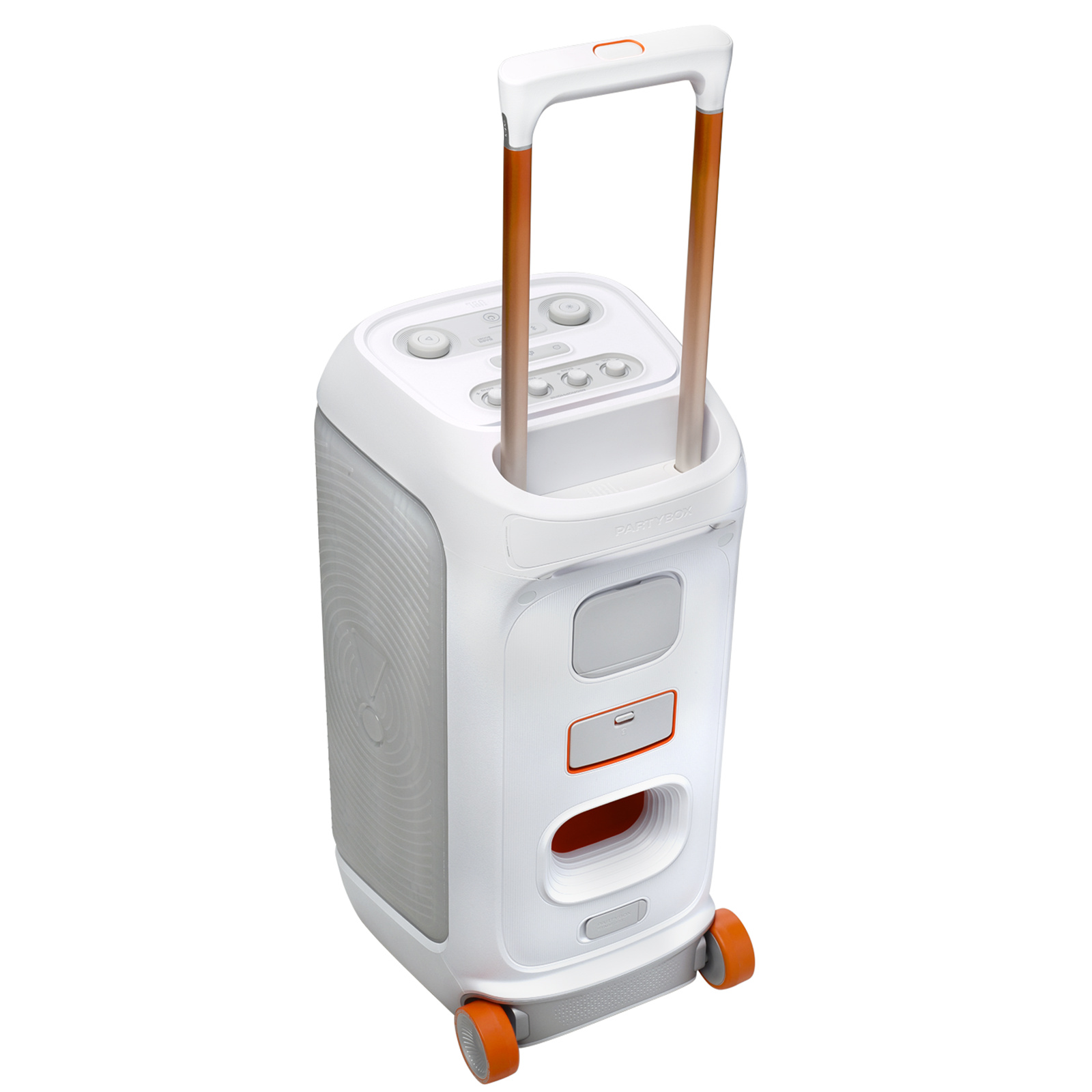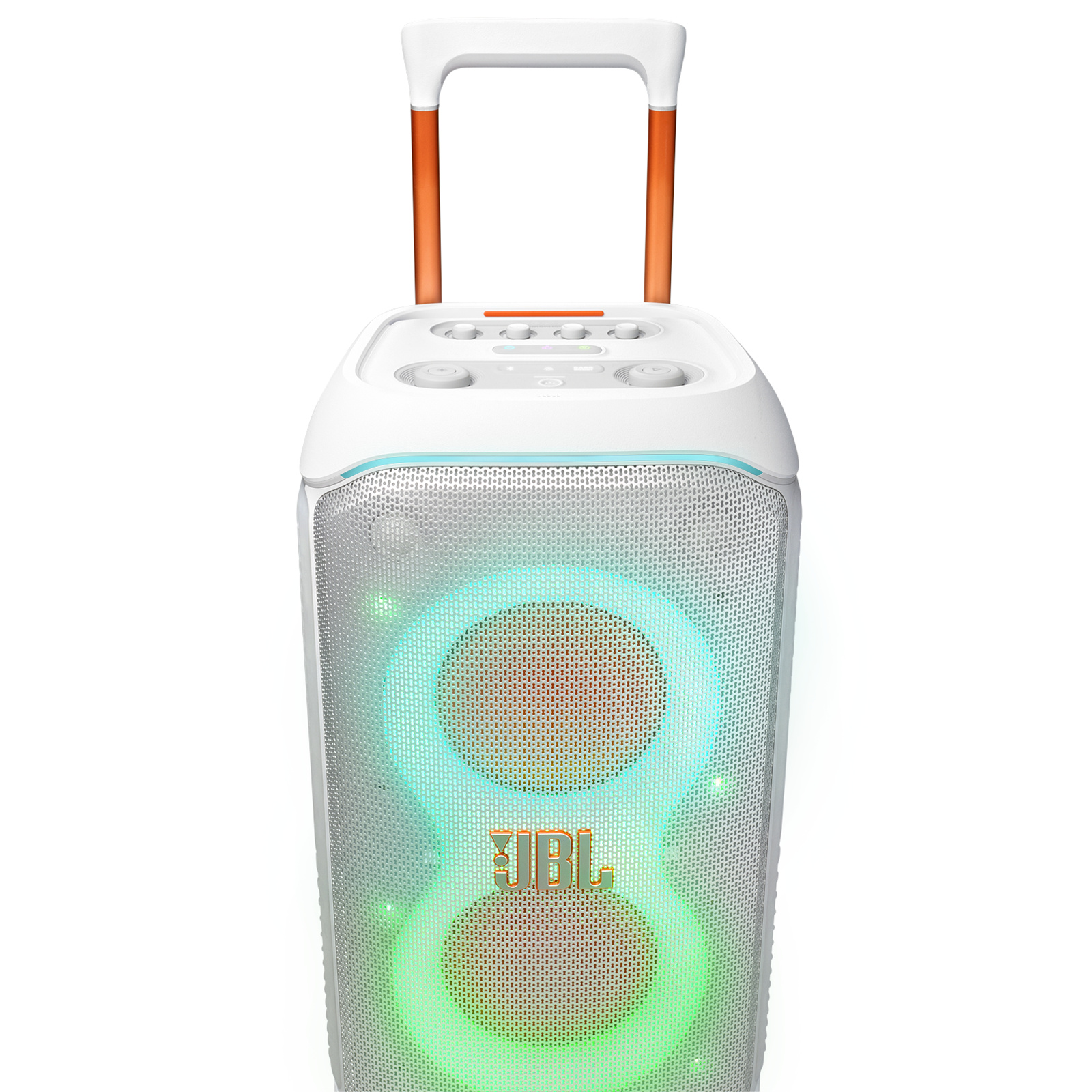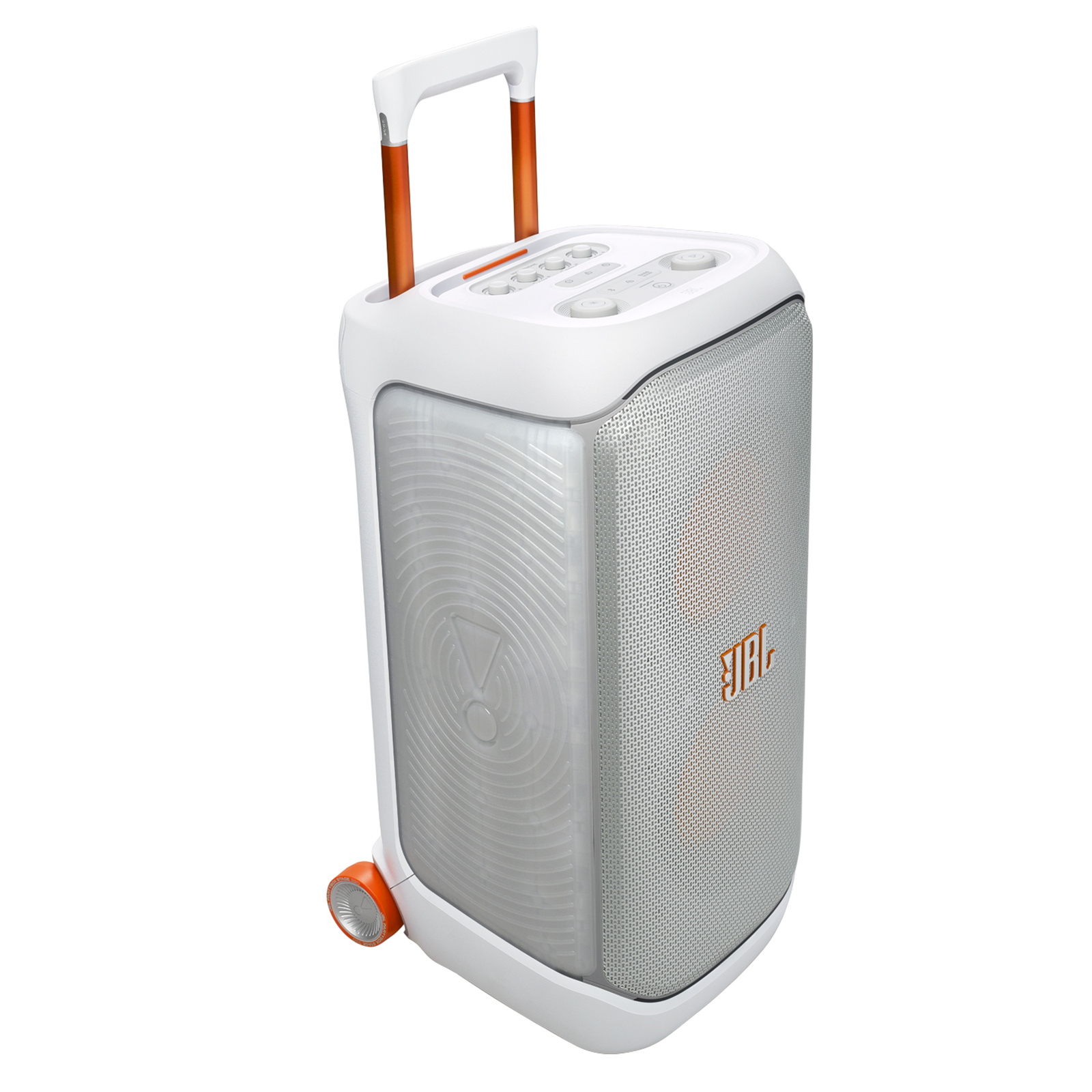Portable party speaker with powerful JBL Pro Sound, an adaptive lightshow, splashproof, replaceable battery, telescopic handle and wheels.