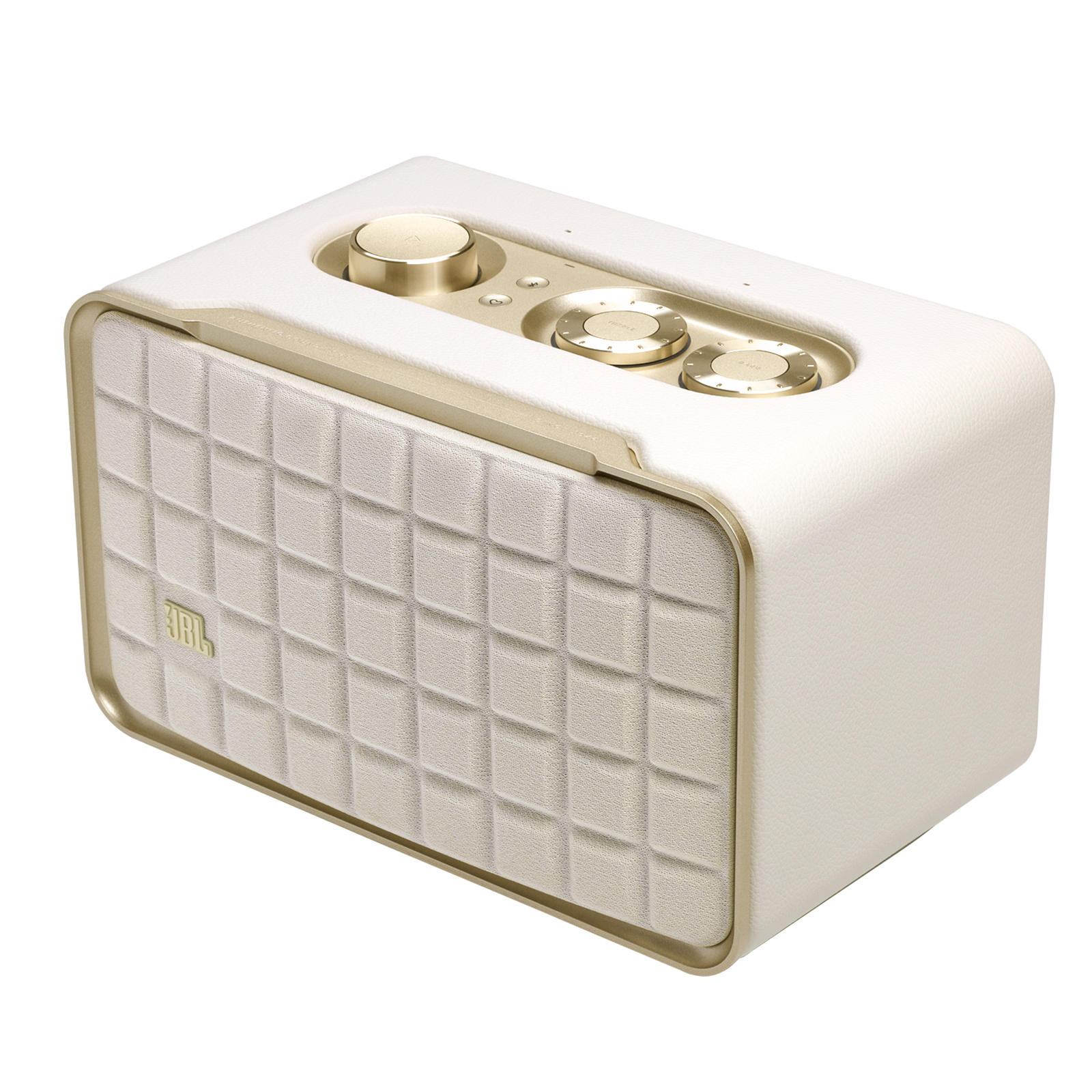 The JBL Authentics 200 is inspired by classic JBL heritage designs for a look that complements any room and fills any space-big or small-with superior JBL sound. And the speaker's premium aluminum frame, custom leather-like enclosure, and reimagined Quadrex grille really show the attention we paid to each visual detail, right down to the JBL signature pattern surrounding the down firing passive radiator.