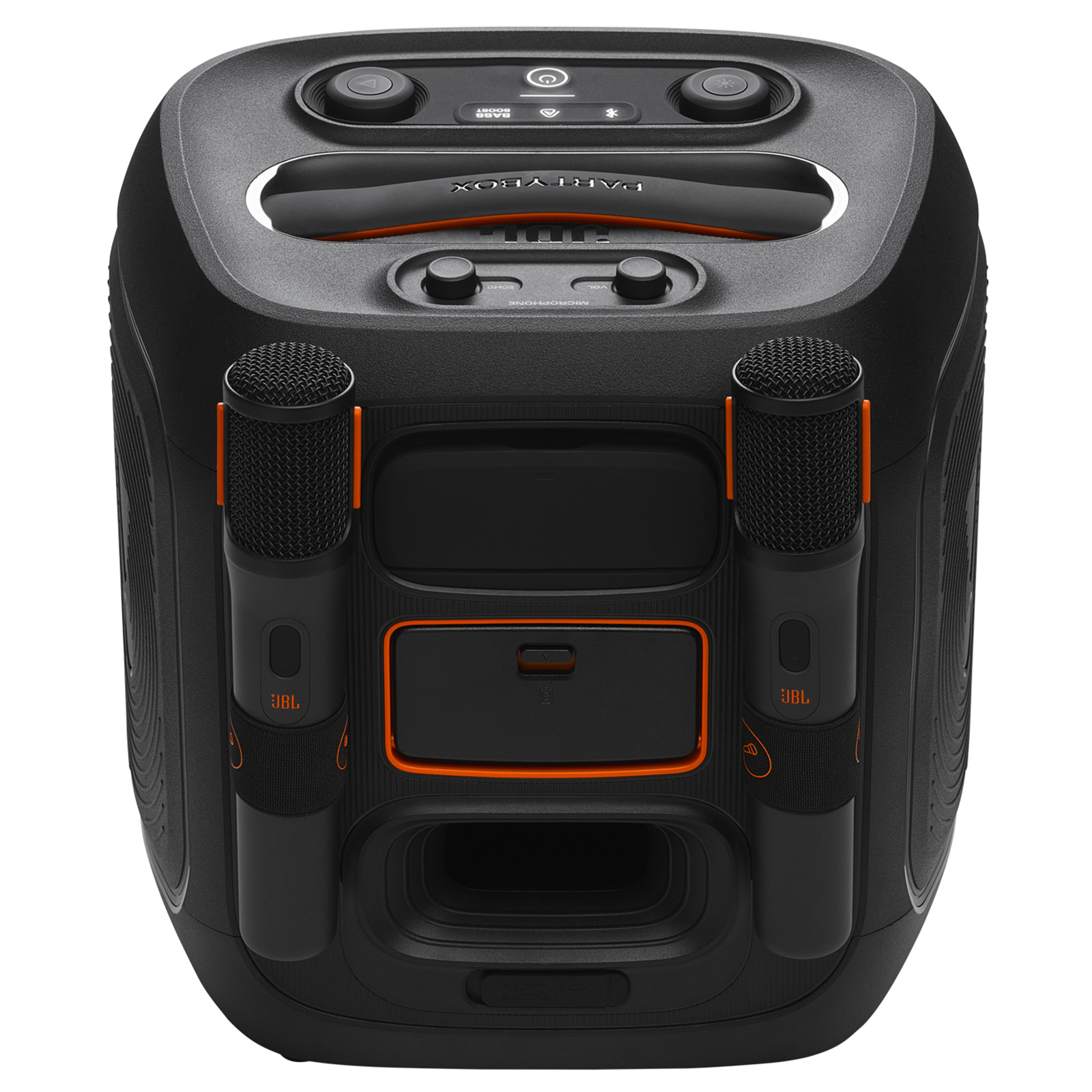 Ready to run the show? Grab the digital wireless mic and become your own emcee or karaoke host! You can also customize your sound with adjustable echo, bass, and treble controls to make sure you sound just right. From open rooftops to crowded basements, the JBL PartyBox Encore 2 knows how to adapt, with its grab-and-go handle and IPX4 splash-proof design.