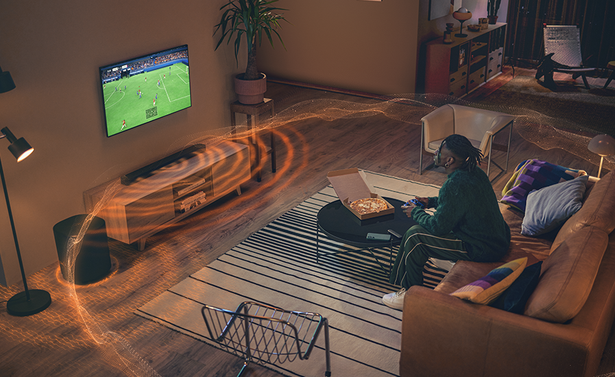 Every room is different. Your soundbar discovers how sound reflects off your walls and furniture. So it'll deliver the best 3D surround effects, tuned specifically for your space and with any TV.