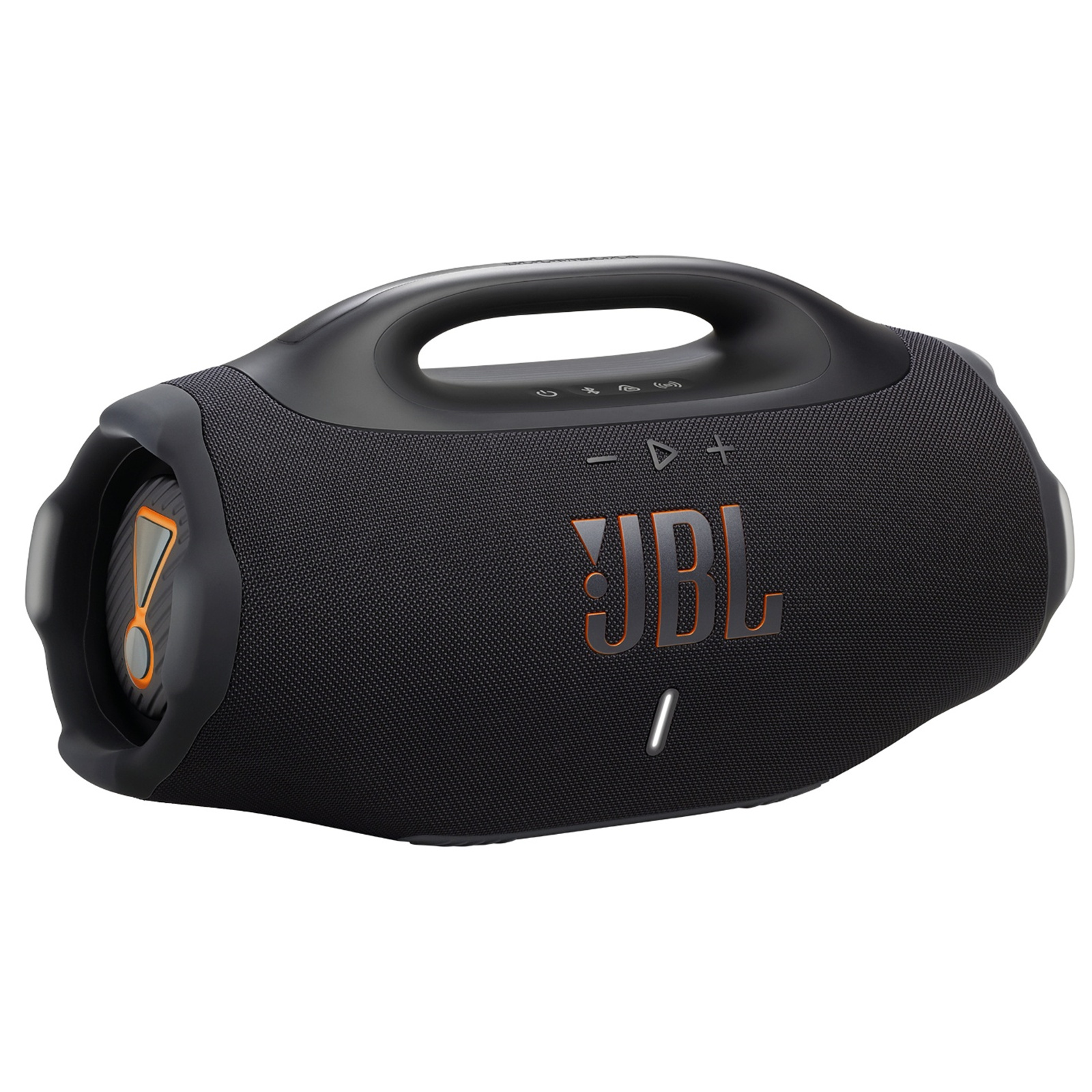 When it comes to bass, we like having options. Fire up the JBL Boombox 4 and you'll get that classic JBL signature bass we all love. Want to take it deeper? Hit the Bass Boost button on the top panel-the JBL Horn mark glows orange, and boom, you're in Deep Bass mode, where those two woofers and three passive radiators go all in. Want something tighter and more energetic? Tap the button twice, the Horn mark turns white, and you're in Punchy Bass mode. Whatever the mood, we've got the bass to match.
