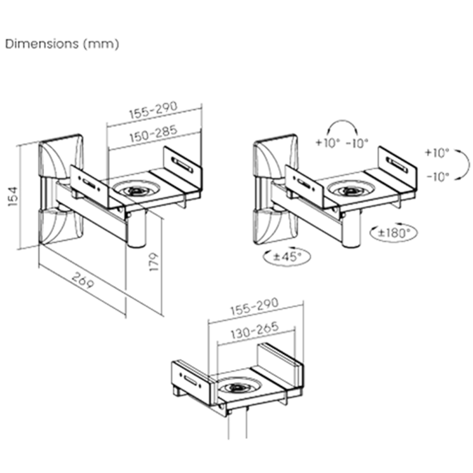 This speaker mount pair features a flexible adjustment which enables it to be compatible with speakers of various brands. The supporting platform's extendable clamp structure with no-slippery pads on its two sides ensures that the speaker in various sizes can fit in and be firmly set on the mount. The platform is also 360° rotative and can tilt 10° in horizontal and vertical directions. Besides, the swiveling arm with concealed cable management provides extra flexibility and a neat look around the speakers. This model also has an excellent weight capacity up to 25kg for each piece. Just one pair of universal speaker mounts can satisfy most of your speakers' mounting needs