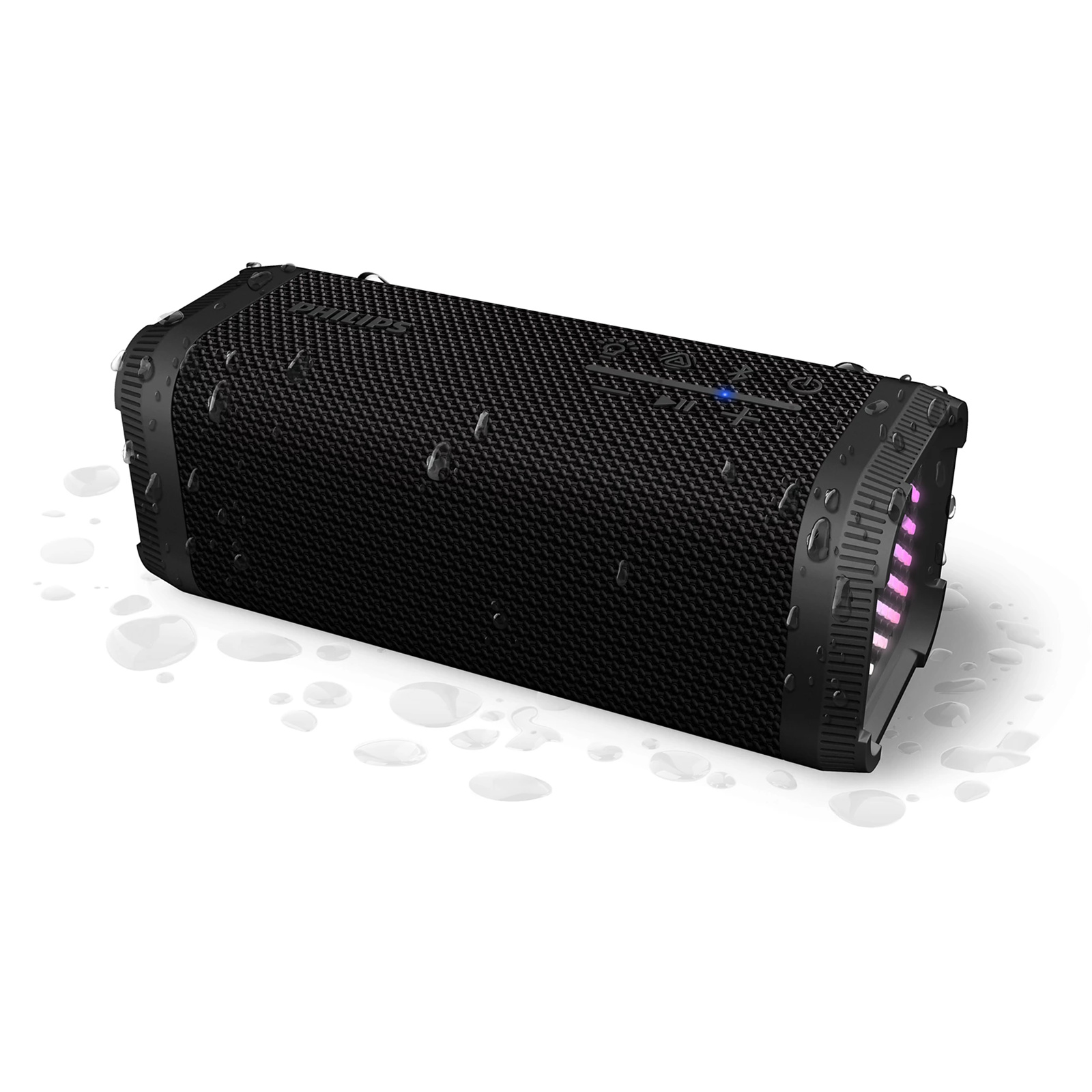 Get out there with the splash-proof compact speaker that gives you up to 20 hours play time on a single charge. Funky LED lights set the vibe, Bass+ delivers deep bass at any volume, and you can connect to other speakers for bigger sound.