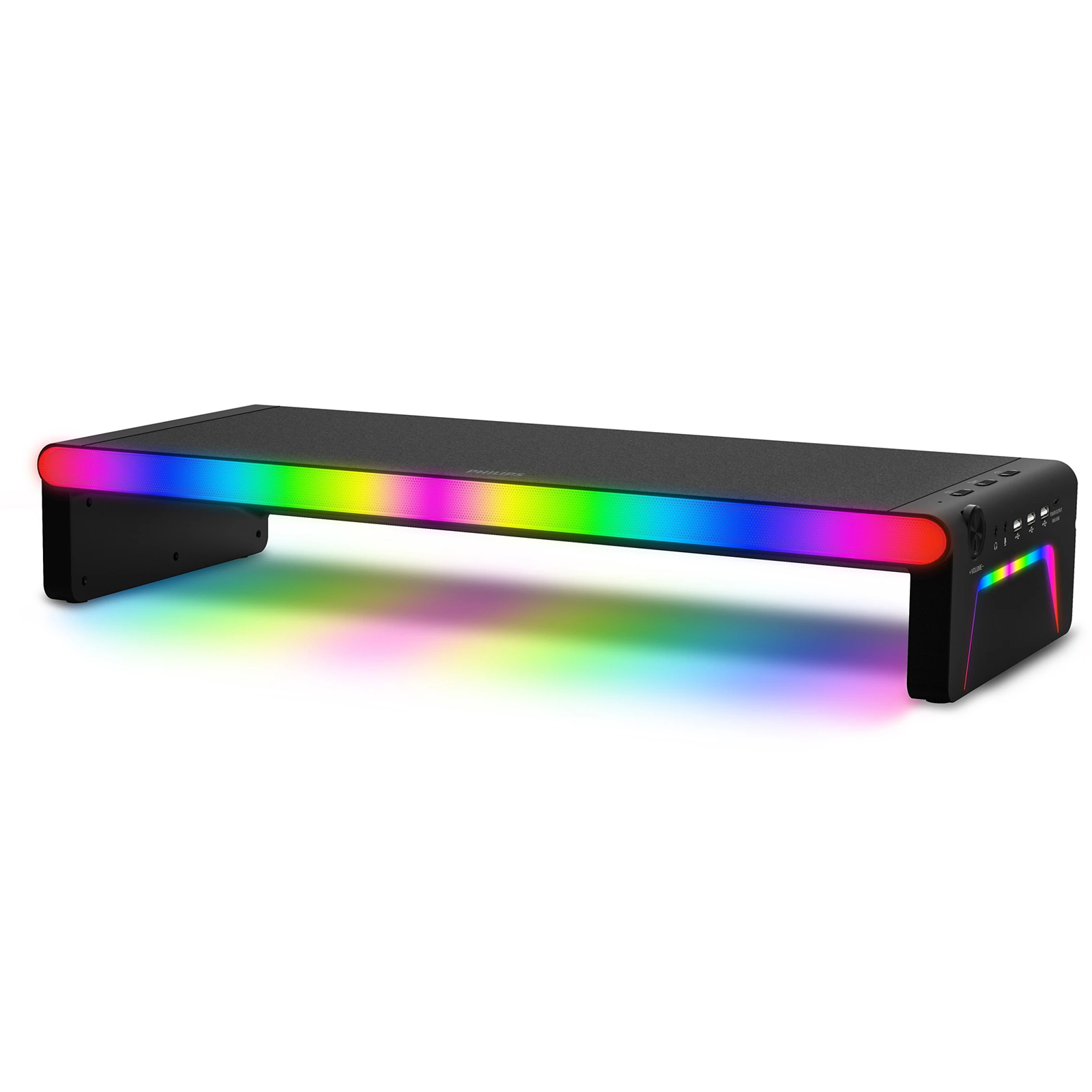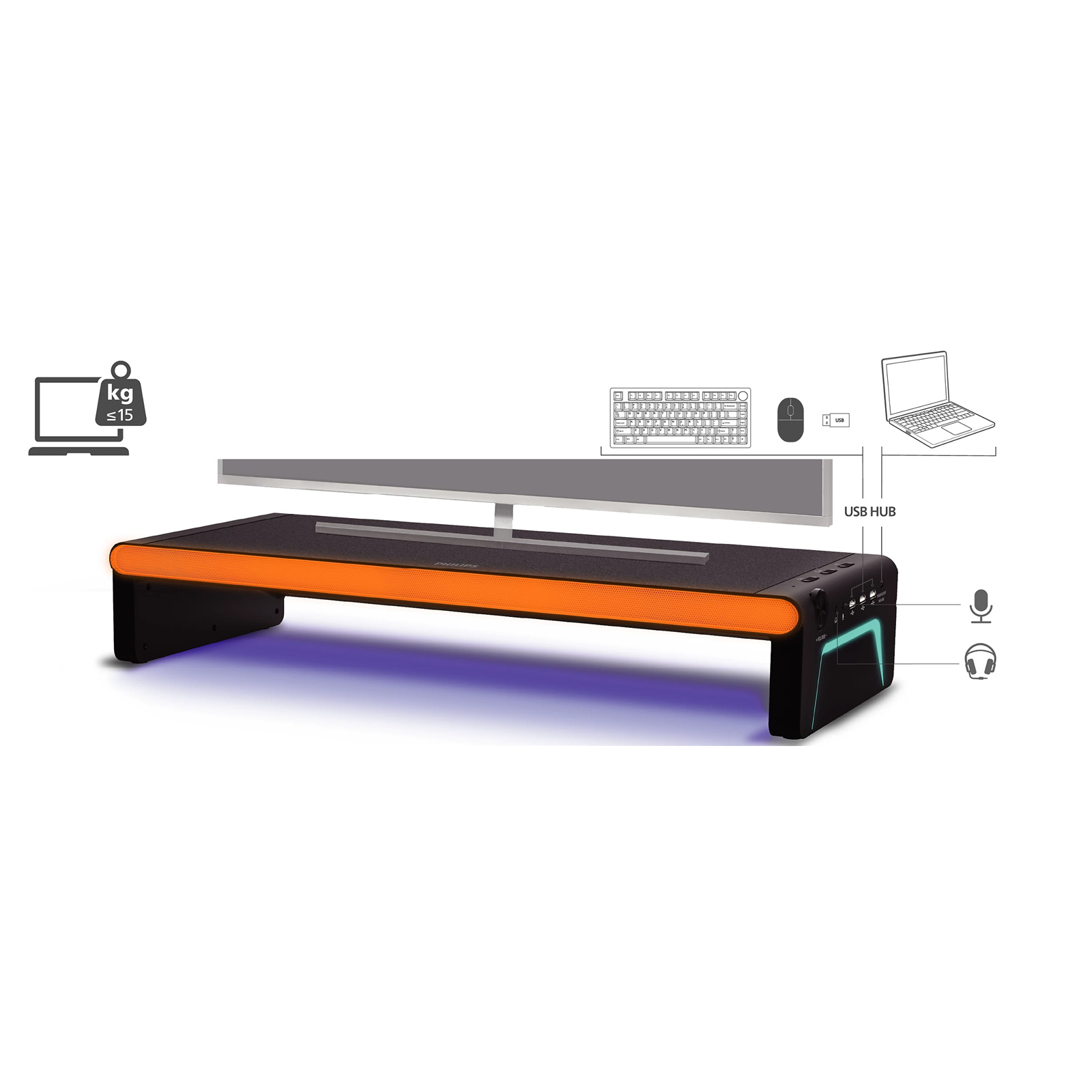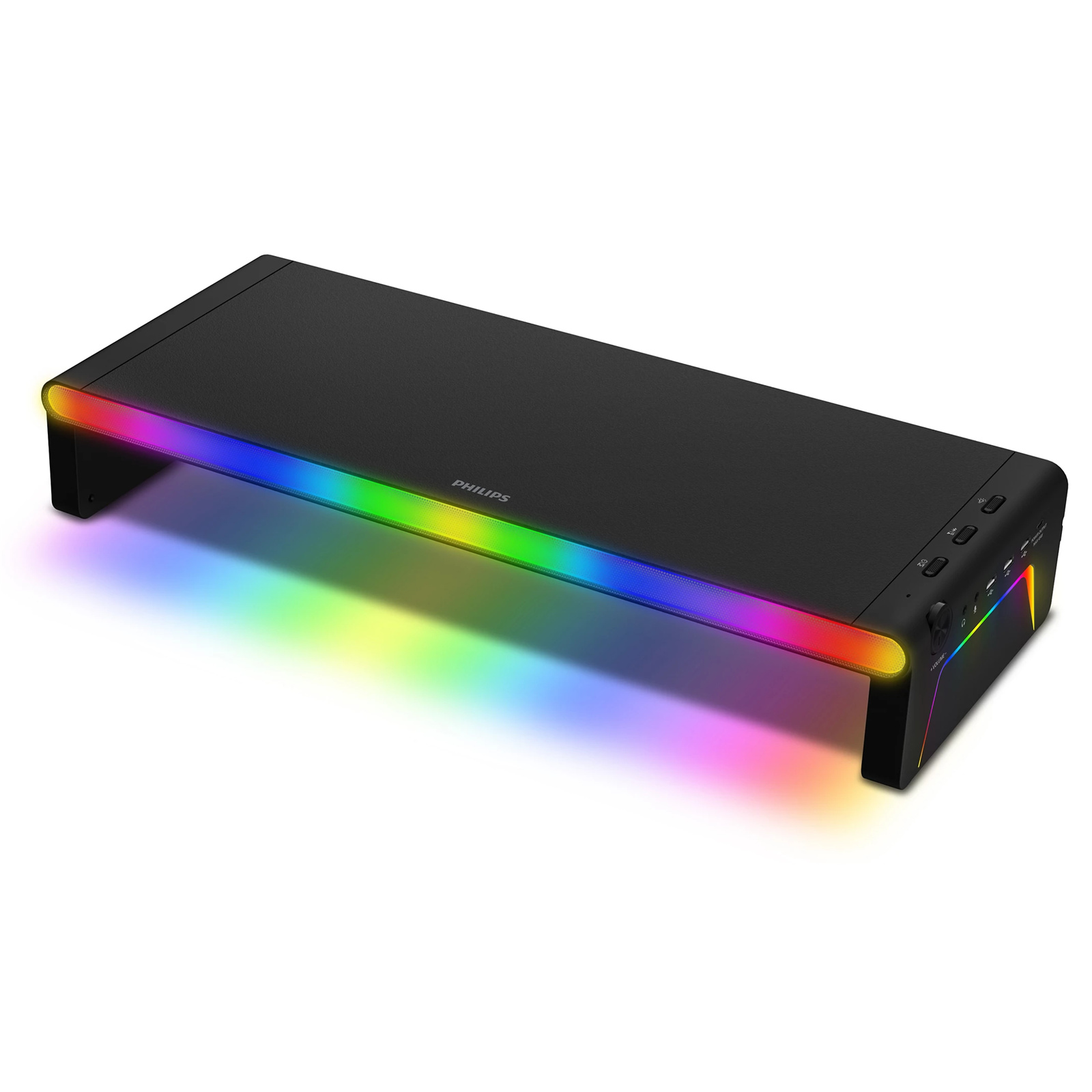Short on space? This versatile all-in-one stand and docking station elevates your monitor, desktop PC, or laptop to the perfect height. The built-in speakers enhance the sound of games or work calls-and the lightshow brings the atmosphere.