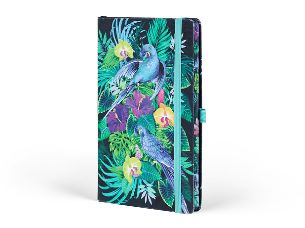 The cover of this notebook is made of recycled and sustainable polyester fabric, produced using plastic bottles recovered from the oceans. With its elegant jungle themed cover, the notebook brings a sense of freshness and inspiration to your writing routine, combining expressive design with a more responsible material choice.