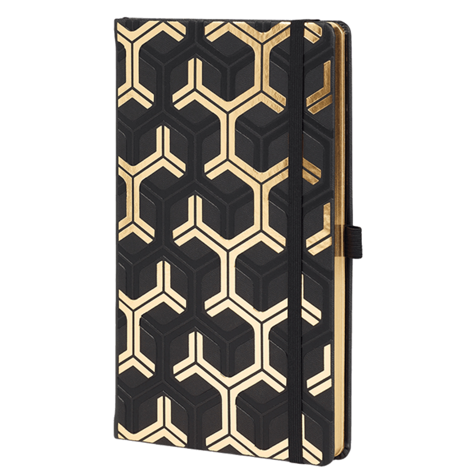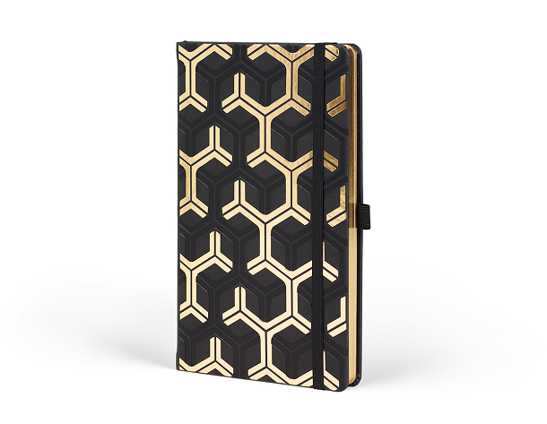 Gold collection notebook and diary with decorative elements inspired by geometric patterns that embellish the cover. Decorative rich elements inspired by Italian classicism embellish these notebooks with an extremely elegant and refined tone. The golden foil actively plays with the tone-on-tone die-cut designs, adding a precious touch to the black cover.