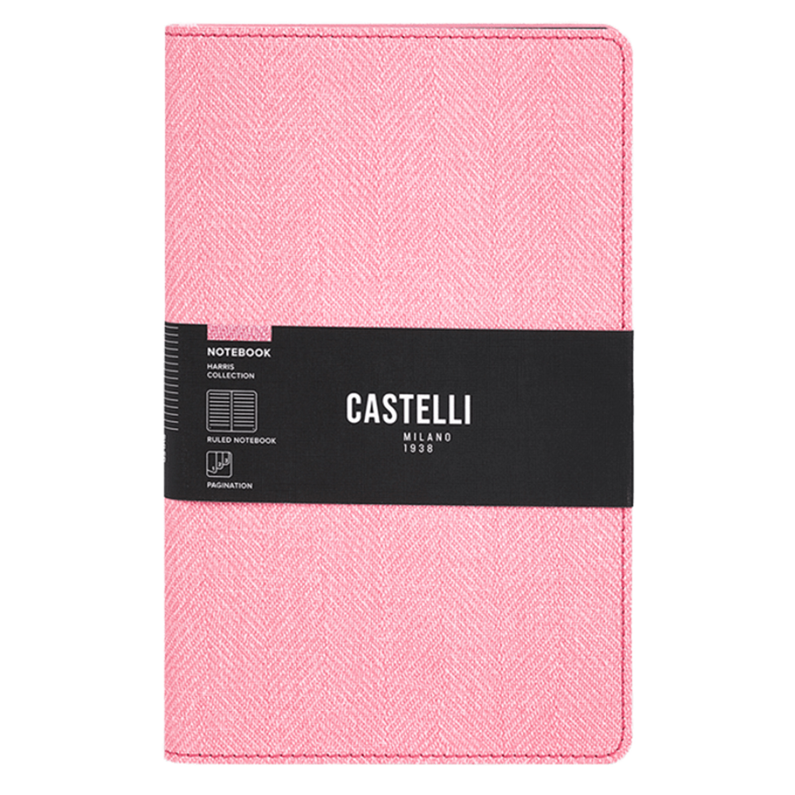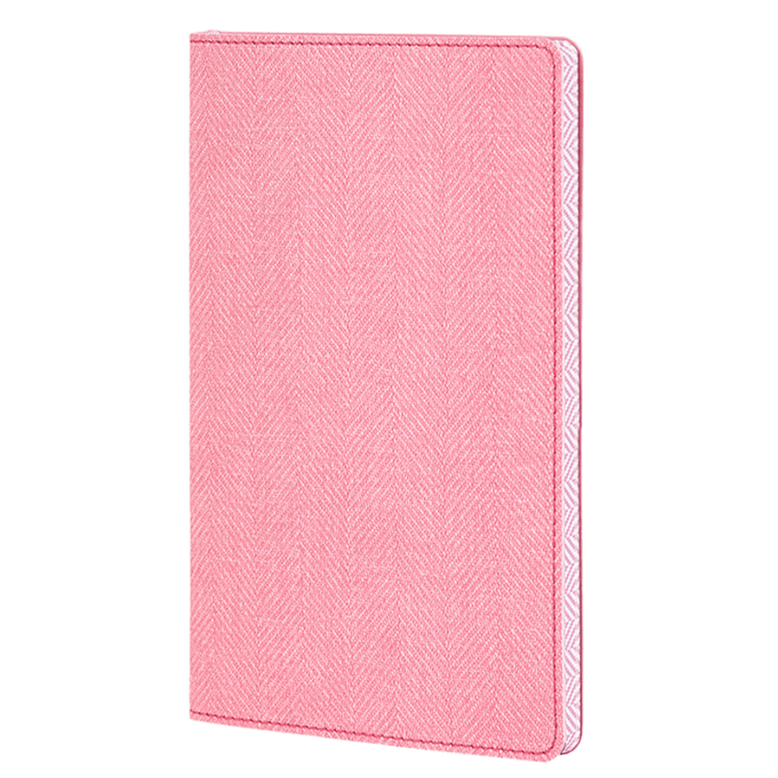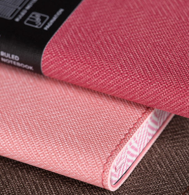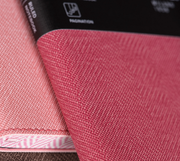 Harris collection notebook with a classic twill weave design flexible cover in flamingo pink, featuring digital printing edges and stitching details. The gentle pink hue adds a touch of charm and sophistication to your workspace, balancing style with everyday practicality.