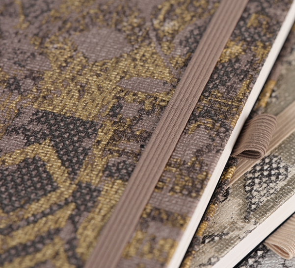 The covers feature intricate patterns, a mix of iridescent hues, and a distressed effect are enhanced by the unique tactile feel of wallpaper: an engaging functionality. The notebook includes an elastic closure, penloop, and a ribbon marker.