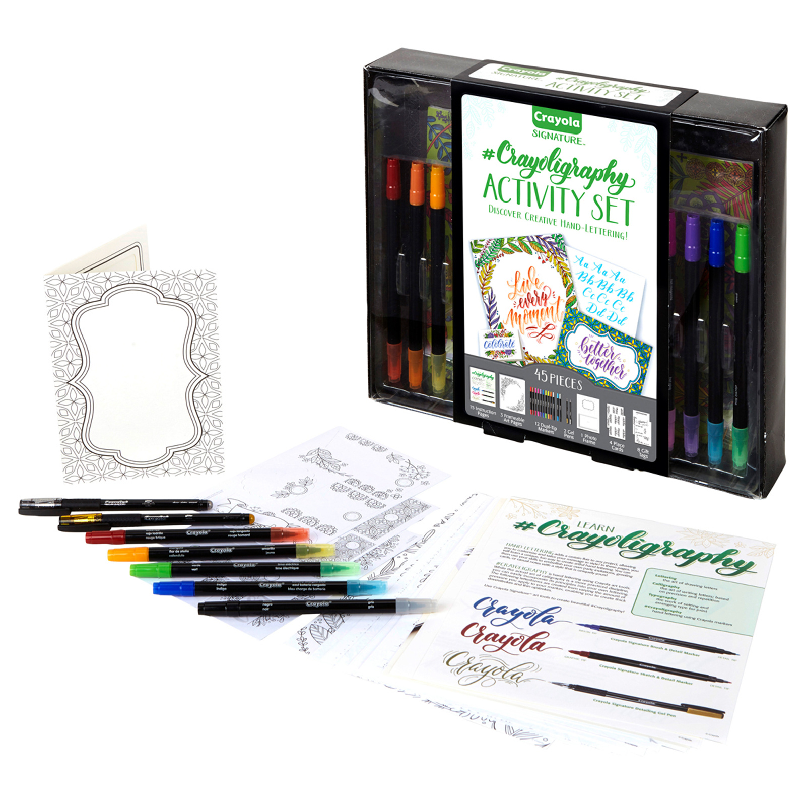 Learn how to hand-letter with the Crayola Signature #Crayoligraphy Activity Set. This kit includes everything you need to learn the art of hand-lettering, including intro and practice sheets, premium markers, and detailing gel pens. Calligraphy is an in-demand craft skill that can add an elegant touch to cards, invitations, and more. Once you've mastered the art of lettering, put your talents to the test with the included gift tags, place cards and paperboard photo frame and create one-of-a-kind mementos.