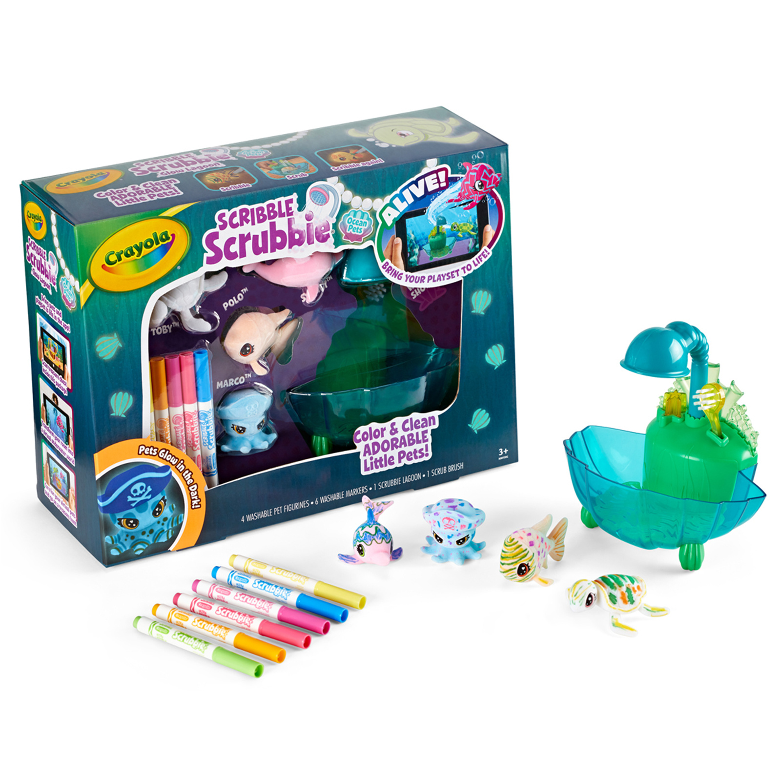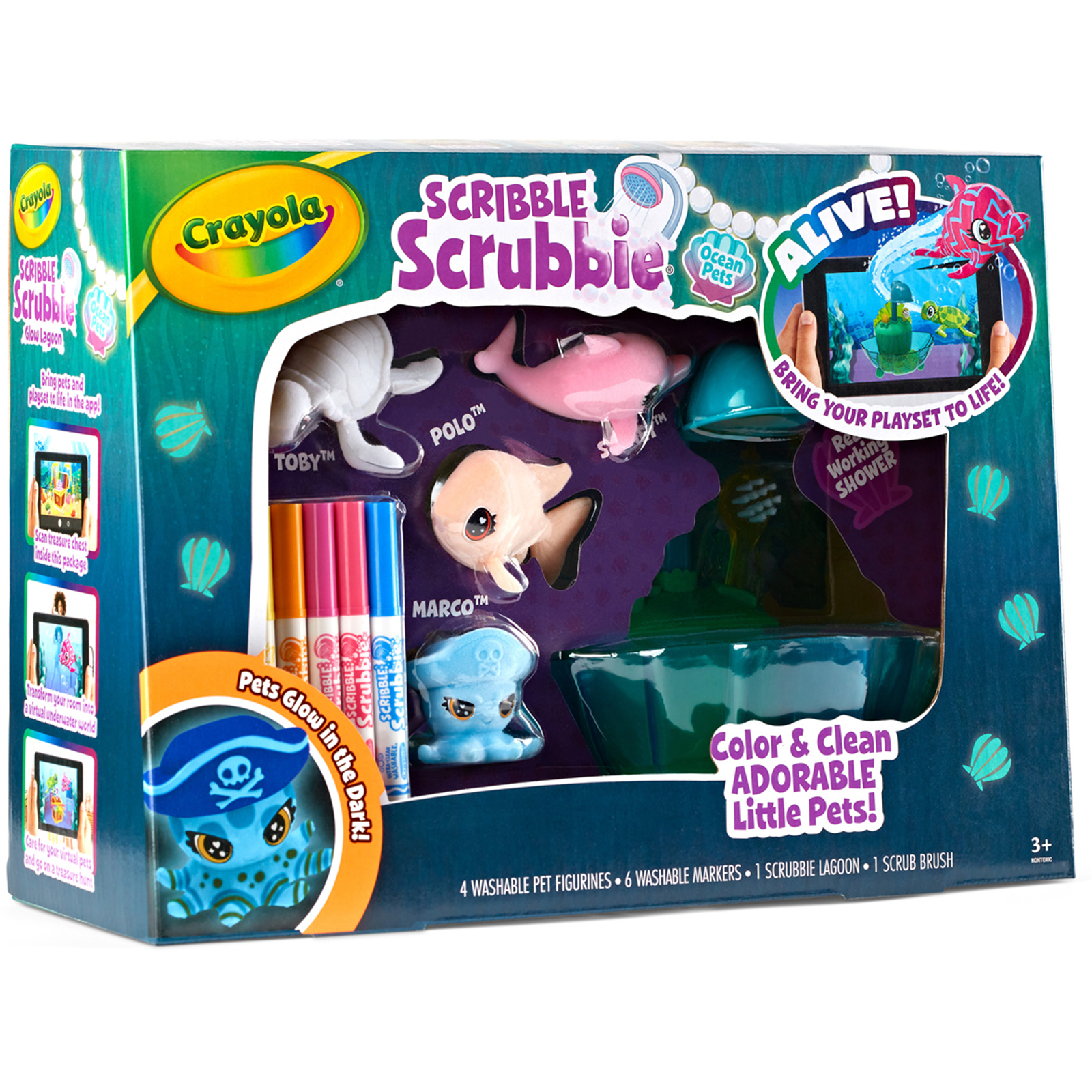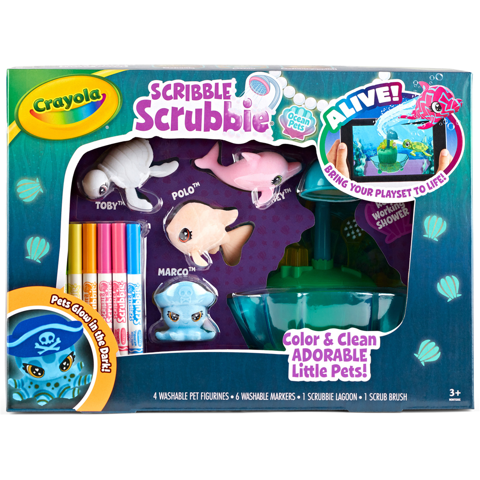 Dive into an illuminated sea of play with the Crayola Scribble Scrubbie Pets Glow Lagoon Playset! It's time to give your Scribble Scrubbie Pets a glow-up in our whimsical underwater world. This vibrant set, featuring glow-in-the-dark animal pals Marco, Polo, Sydney, and Toby, sparks creativity and imagination. The Glow Lagoon set includes 4 Glow Pets, 6 Crayola washable markers, 1 working scrub tub, and 1 brush. This captivating crew of sea creatures sports a flocked white coat, perfect for decorating in bold, washable colors. Once your child has created their marine masterpieces, these pets can take a scrub in the tub and start again, offering endless colorful adventures! Add a splash of tech to your play with the free Scribble Scrubbie App. Transform your Scribble Scrubbie collection into digital pets! Easy to play and interact with, these digital dabblers offer an extra layer of fun. The Crayola Scribble Scrubbie Pets Glow Lagoon set is not just loads of fun - it's safe and nontoxic, appropriate for children 3 years and up.