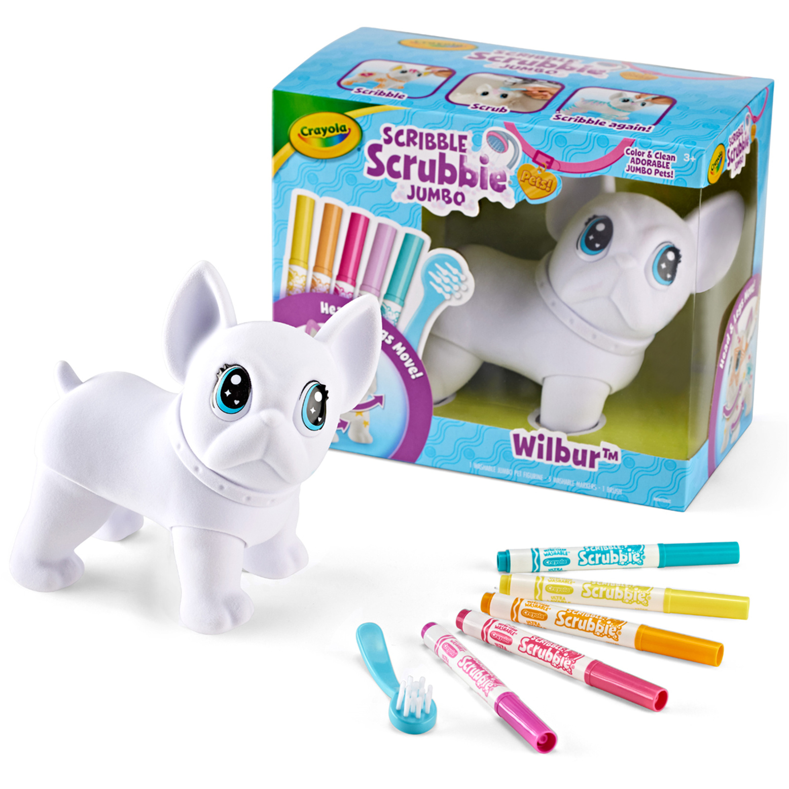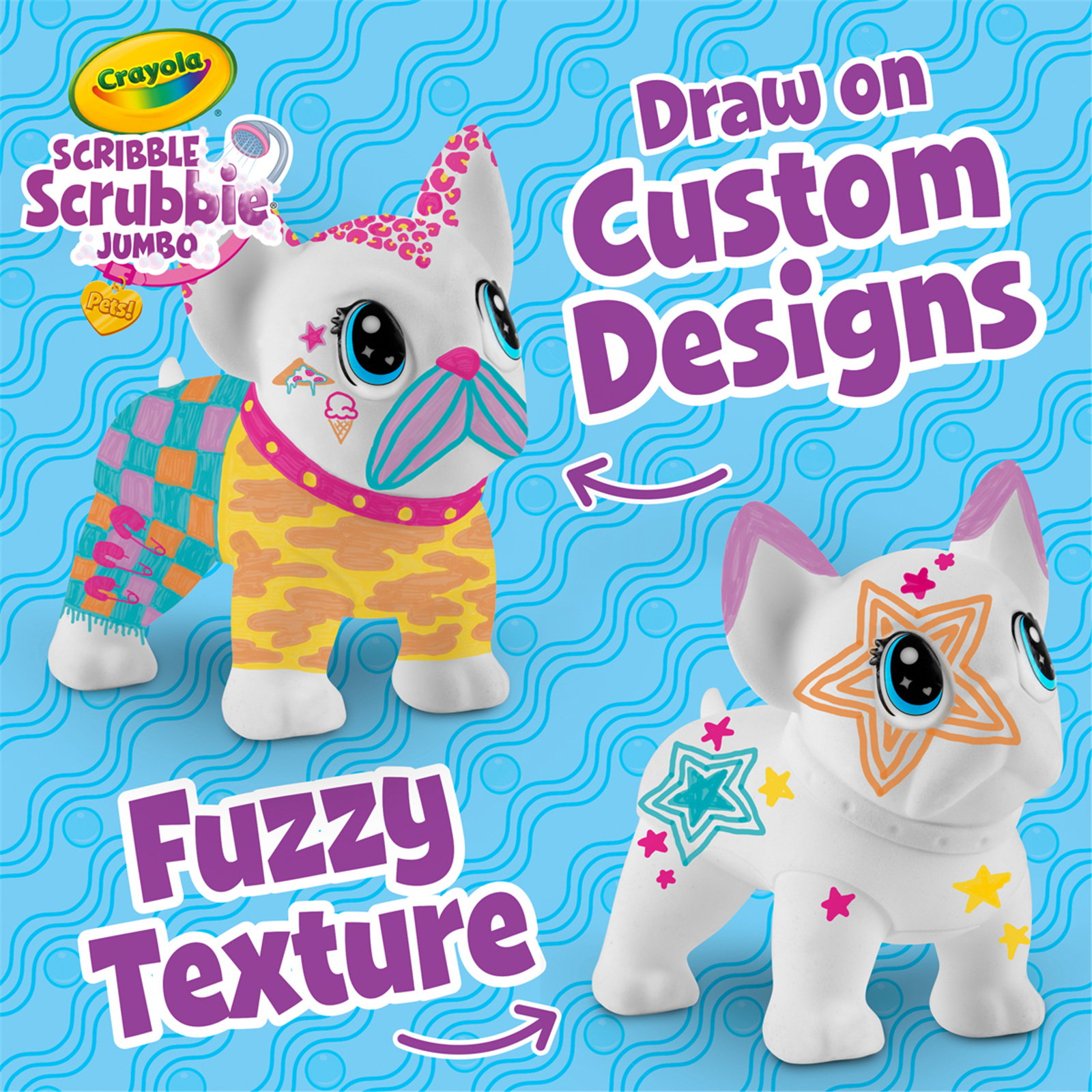 Scribble Scrubbie Pets go Super-Sized with the new Jumbo pet, Wilbur! Not only is he six inches in height, but his head and legs are poseable too! Wilbur has the same fuzzy exterior as the original Scribble Scrubbie Pets, and can be colored and washed to create new designs again and again! Use the included 5 Ultra-Clean washable markers or any Crayola Ultra Clean Markers you have at home. Great for girls and boys, this lovable French Bulldog will inspire creativity and cuddles! It makes a standout birthday or holiday gift, whether you are adding it to a growing collection of Scribble Scrubbie Pets or starting a new one! Safe and nontoxic for kids, ages 3 & up!