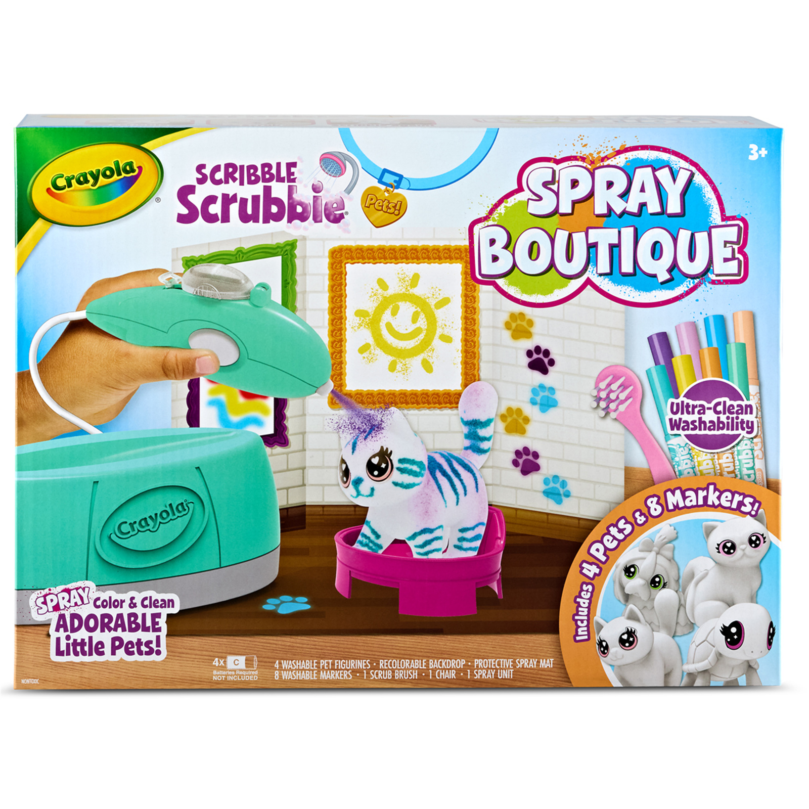 Get ready to SPRAY, Scribble & Scrub with the Crayola Scribble Scrubbie Airbrush Set! This exciting playset includes 4 Pets, 1 Airbrush Sprayer Unit, 8 Markers, 1 Brush, and 1 Backdrop with a Mat. Set the scene then, color directly on your pets or use the airbrush sprayer for custom designs! When you're ready for a new look, wash them clean and start again. The fun never stops with this set, which is compatible with all Scribble Scrubbie Pets, markers, and playsets. Give this art kit as a gift for kids ages 4 and up. Note: Requires 4 C batteries (not included).