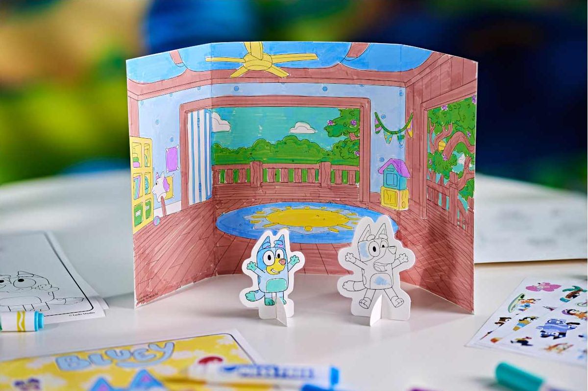 The kit includes 27 Bluey Coloring Pages, 8 Mess-Free Markers, 4 Sticker Sheets, 2 Die Cut Cardstock Character Cutouts, and 1 Trifold Background Scene.