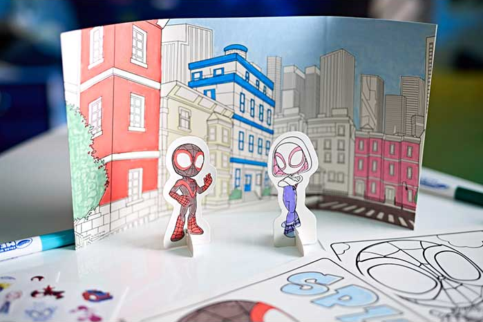 This kit features 27 Spiderman Coloring Pages (8"x10"), 2 Die-cut Cardstock Character Pop-outs, 1 Trifold Background Scene, 8 Mess-Free Markers, and 4 Spiderman Sticker Sheets (5"x7").