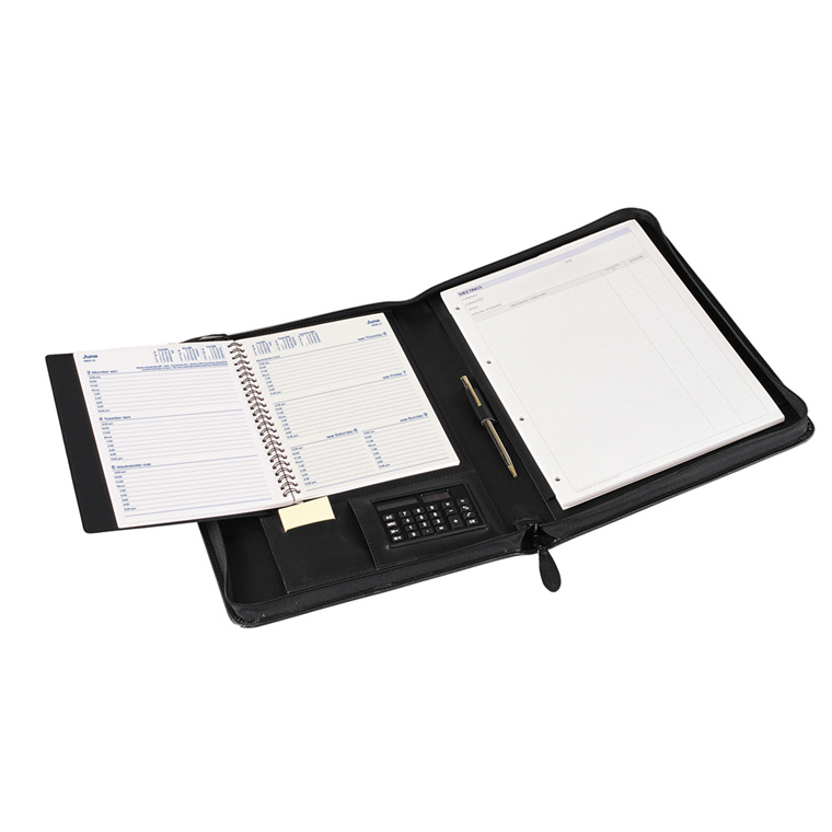 Touted as the ultimate solution for busy professionals, the Portfolio Plus combines essential tools into a single compact package. It includes a built-in calculator, zippered pocket for secure storage, pen loop, adhesive notes, a refillable meetings notepad, and an A5 undated Week-to-View wiro diary-all designed to stay organized on the move.