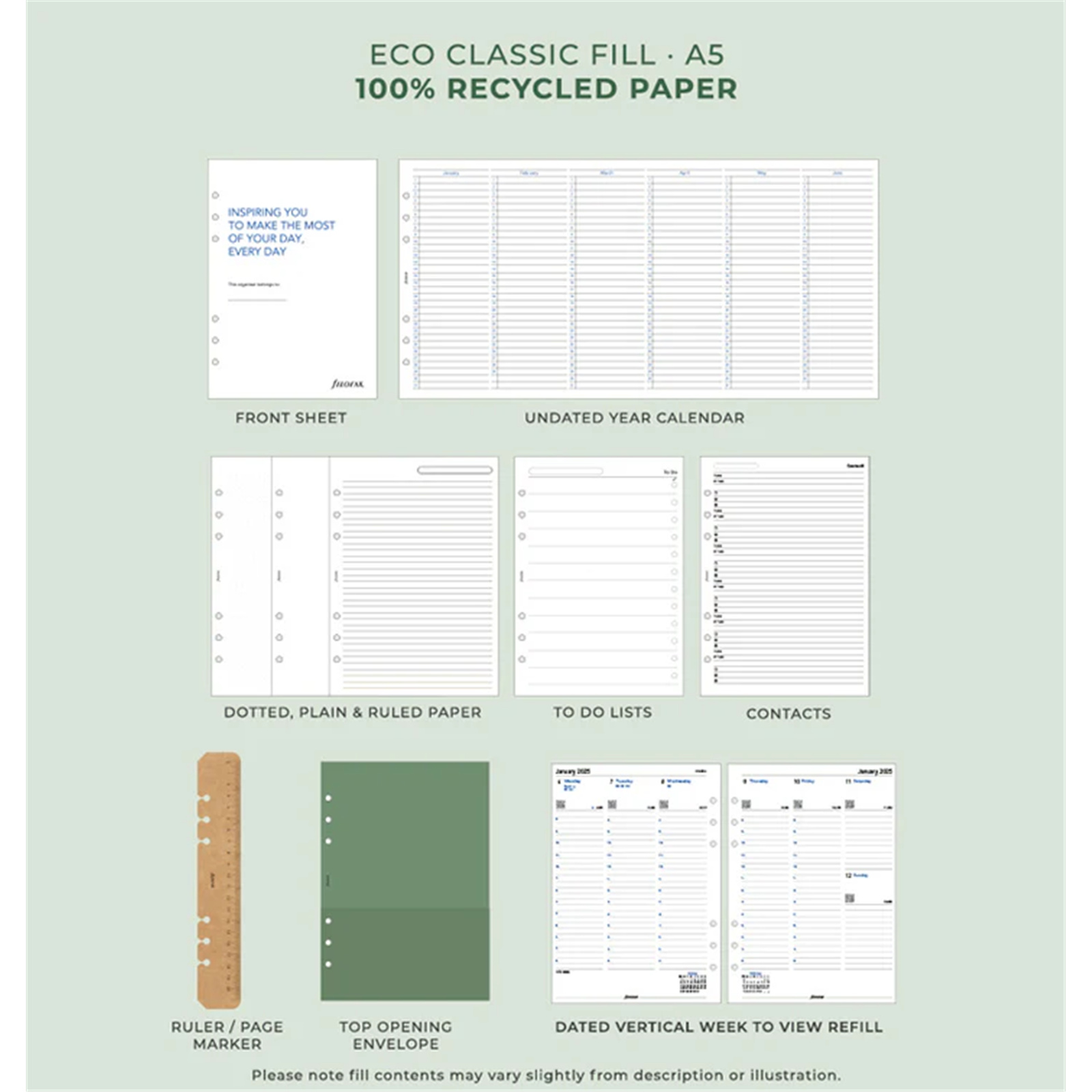 Dated Week to View Refill (English language), paper flyleaf, front sheet, undated year planner, dotted paper, plain paper, ruled paper, to do lists, contacts, eco ruler / page marker, cardstock envelope. Please note contents may vary to those listed or shown in product images.