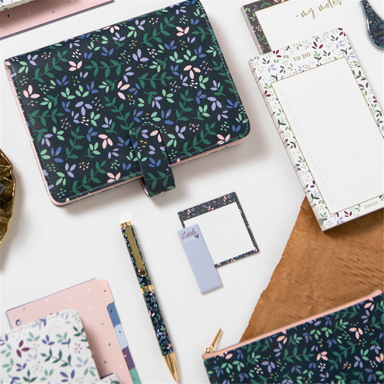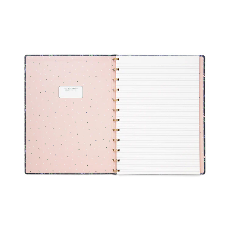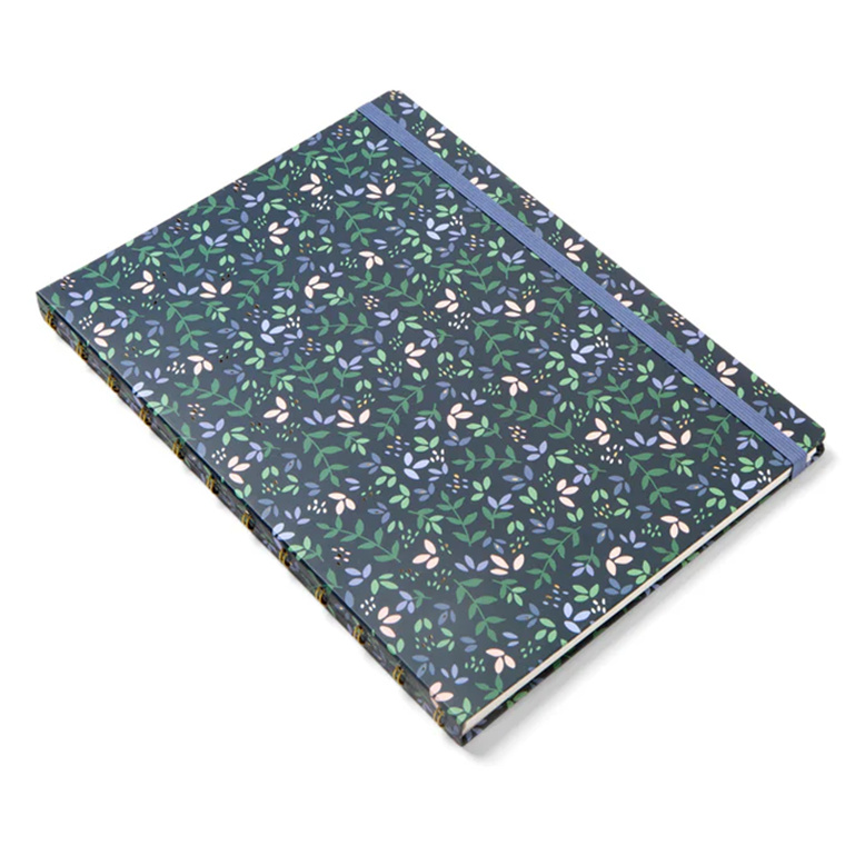 Add some floral flair to your notes with this A4 refillable notebook from the Garden Collection. The laminated cardboard cover features a beautiful green and blue patterned interior with gold foil accents. This notebook lies flat and can be used with repositionable and refillable content. The patterned interior is also in complementing colours and utilises 100gsm fountain pen friendly paper across 56 ruled pages.
