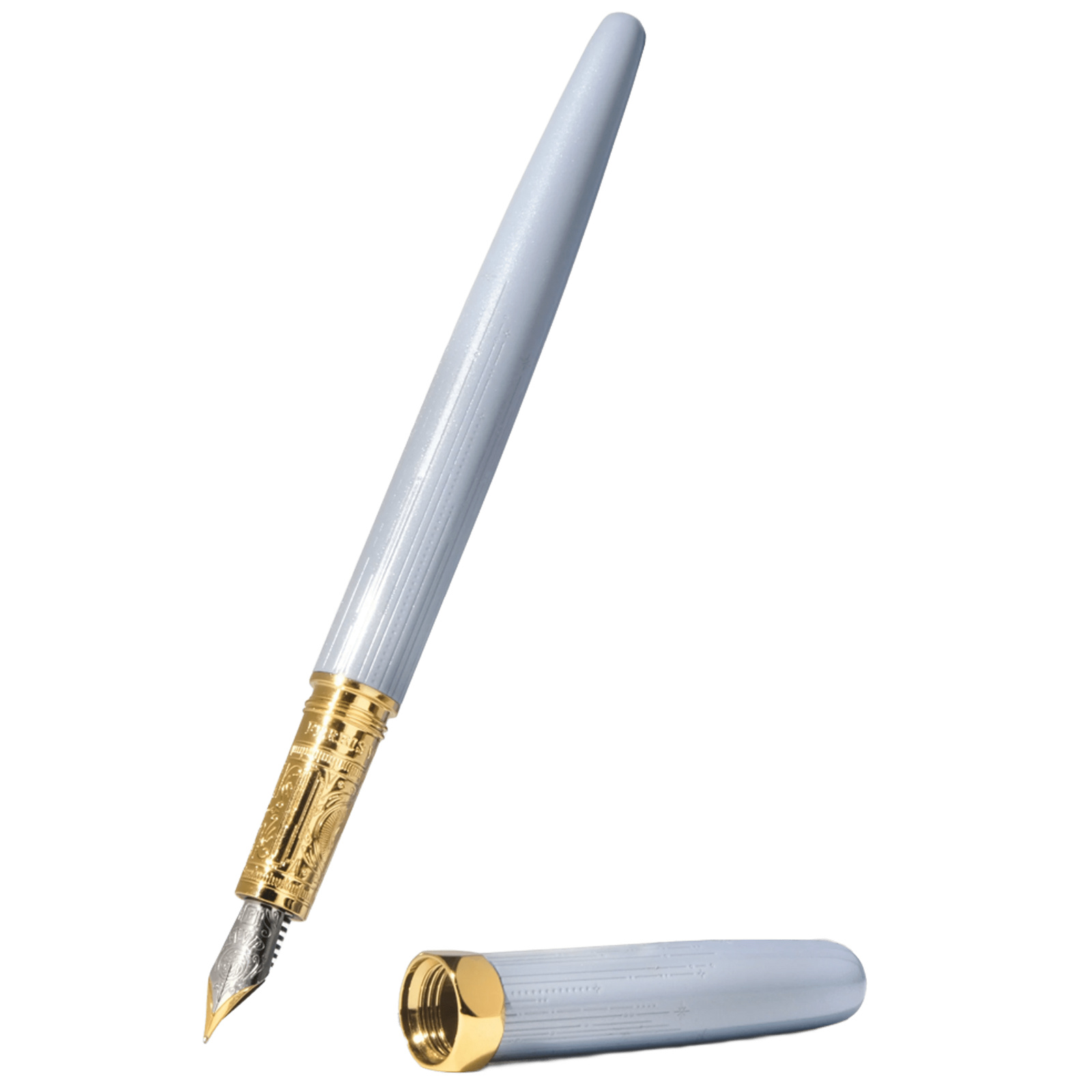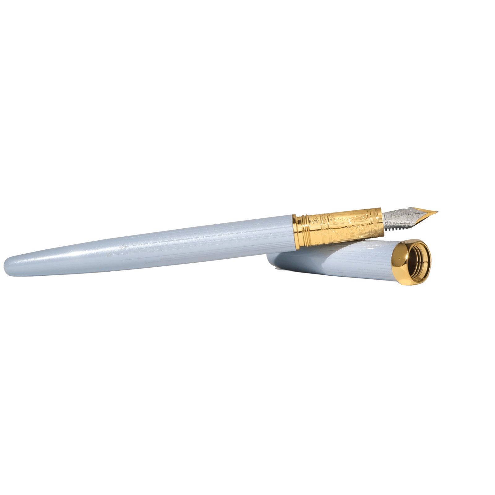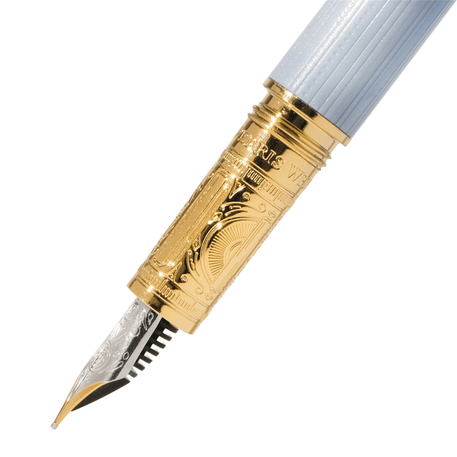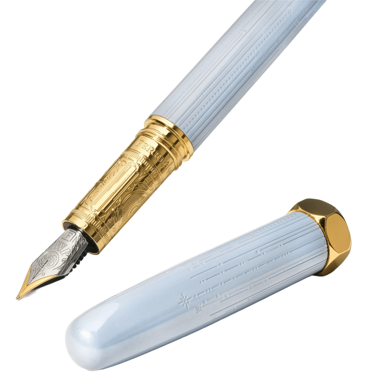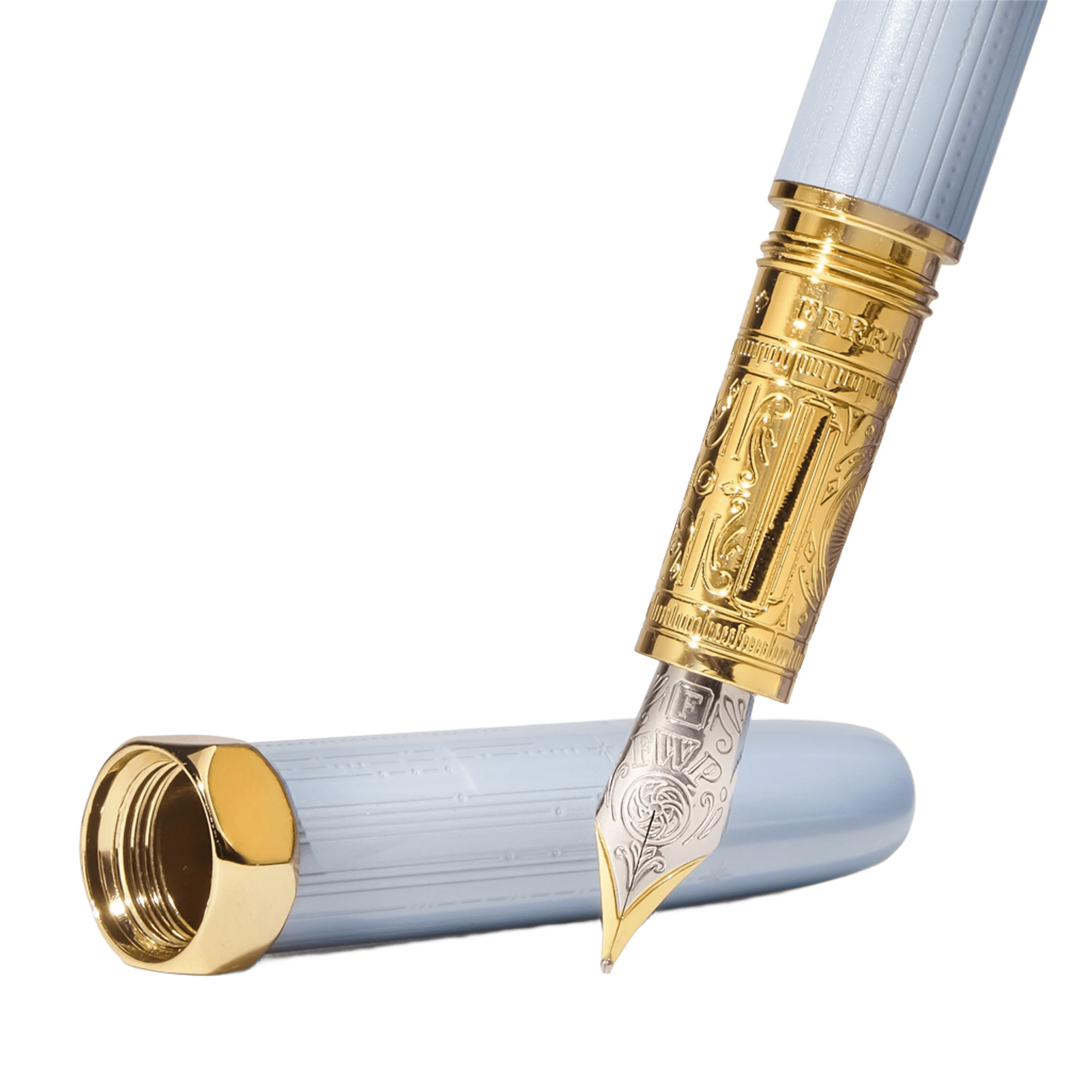 Our newest masterpiece, The Bijou Fountain Pen in Forget Me Not blue, is inspired by crowned jewels and characterised by its sparkling Snowfall lacquer finish. For the first time ever, the lacquered bodies are intricately engraved to continue the story - can you decipher our secret messages? This symphony of visual delight continues with a detailed grip design and double gold-plated brass hardware.