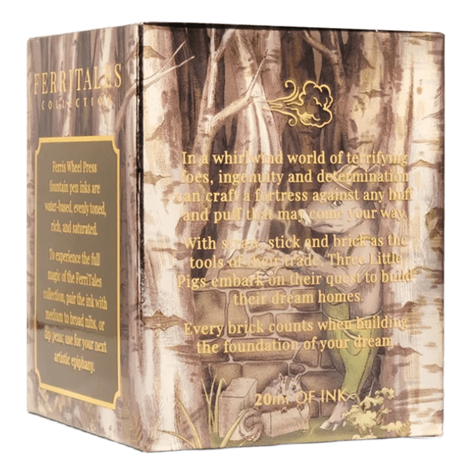 Under the dappled canopy of the thick forest, the Big Bad Wolf creeps with a sinister grace, eyes glinting and cunning. As minutes pass, he watches a familial scene unfold. The eldest of the brothers works diligently, getting more annoyed as his younger siblings frolic, only feigning hard work. The wolf lurks and considers if he wants to interject on such a tense family scene, or if his growing appetite is worth the awkward conversation… Colour your curiosity with this ash brown ink and satisfy your creative appetite.