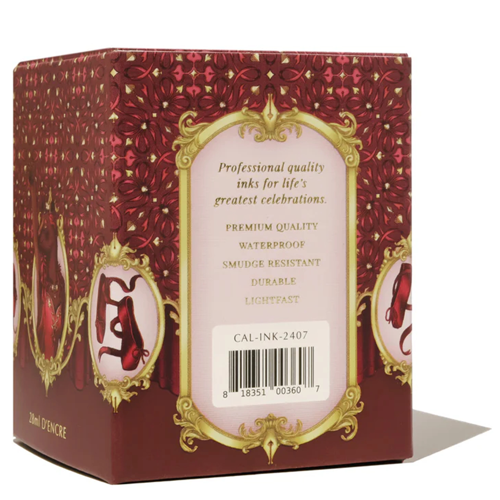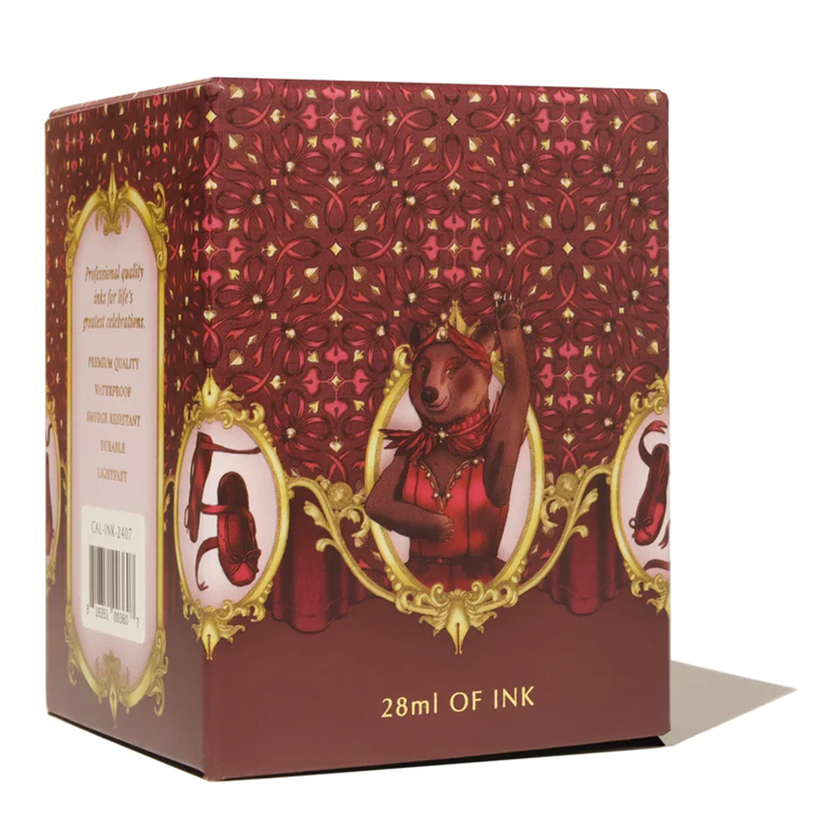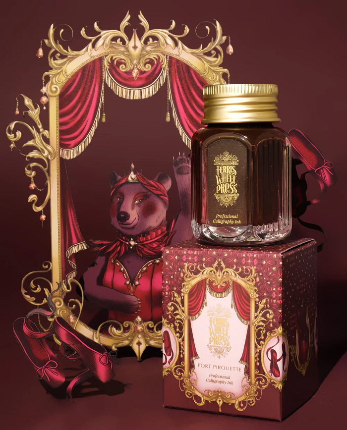 Professional calligraphy ink made for life's most memorable celebrations. You are cordially invited to watch a special performance: for one night only, the Velvet Ballet Company is raising its wine-red curtains once again for the return of Swan Lake. Starring the one and only, Prima ballerina Madam Bear, she will surely entrance all with her undisputed elegance. Immerse yourself in the dulcet tones of an acclaimed ballet, brought to life in this classic burgundy shade, enriched with a touch of magic in its gold shimmer.