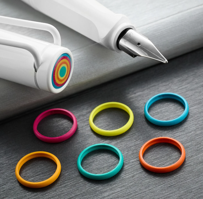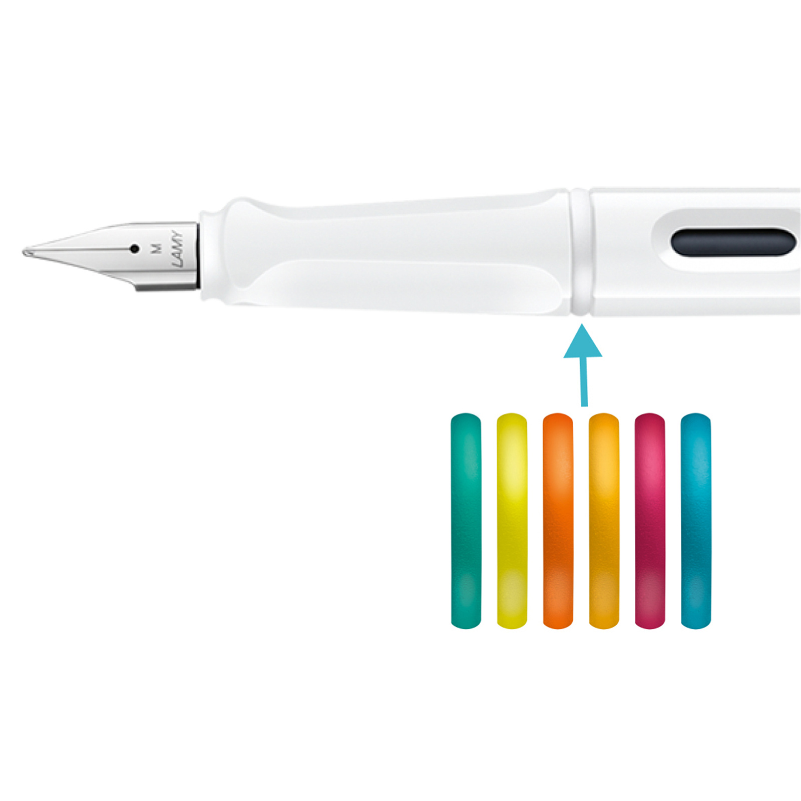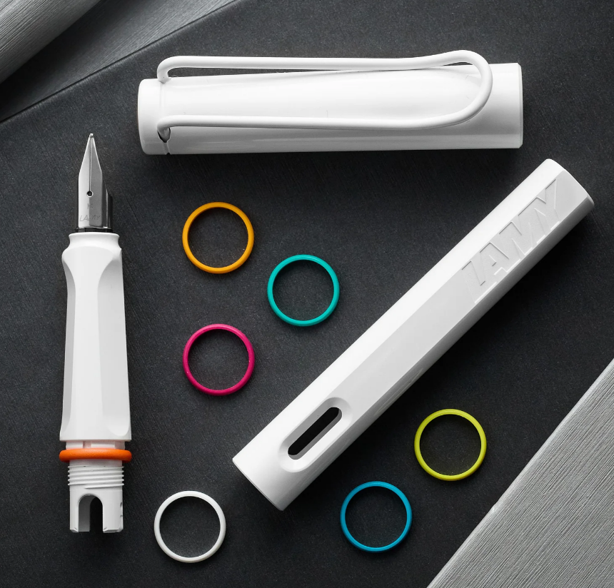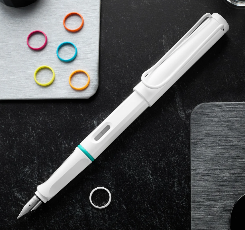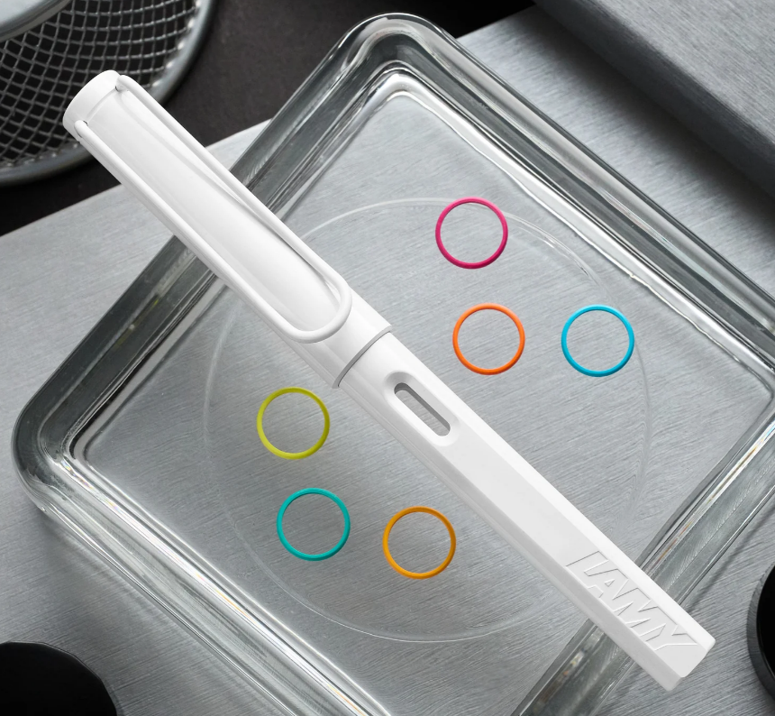 This striking white version of the Lamy Safari boasts a polished silver steel nib, complemented by white trim, a white grip section, and a default white accent ring. For further personalization, the set includes six additional accent rings in pink, red-orange, light orange, yellow, green, and turquoise. Swapping out rings is a breeze, thanks to the pen's clever design.