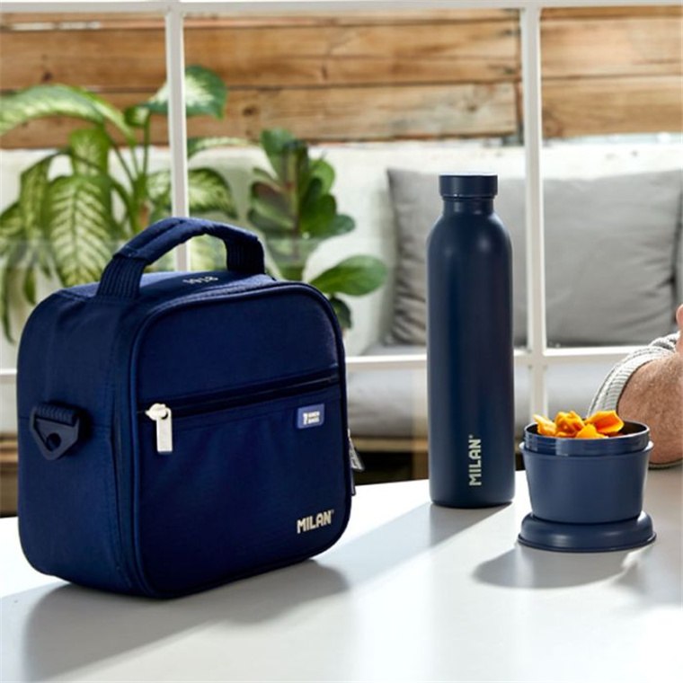 Milan isothermal food bag. Includes 3 lunch boxes: 1 rectangular box with lid, 1 square box with lid, and 1 hermetic round box with screw lid. Thermal insulated interior (cold/hot) for a better food preservation. Full opening for better accessibility and cleaning. Practical zipped pocket inside. Adjustable and removable strap. 'Ripstop' outer fabric: light and resistant to riping and tearing. It uses a special technique that weaves thick, reinforcement threads at regular intervals creating a crosspatch pattern. Fabric composition: polyester outer fabric and isothermal inner lining (P.E.V.A.). Size: 23 x 20 x 11 cm. Capacity: 3.5 litres.