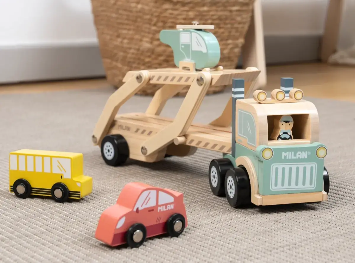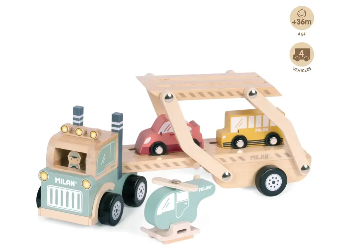 Recommended for children 36 months and over, the Milan Wheels on the Road Vehicle Transporter provides a balanced combination of fun and learning, supporting early developmental milestones while delivering hours of engaging play.