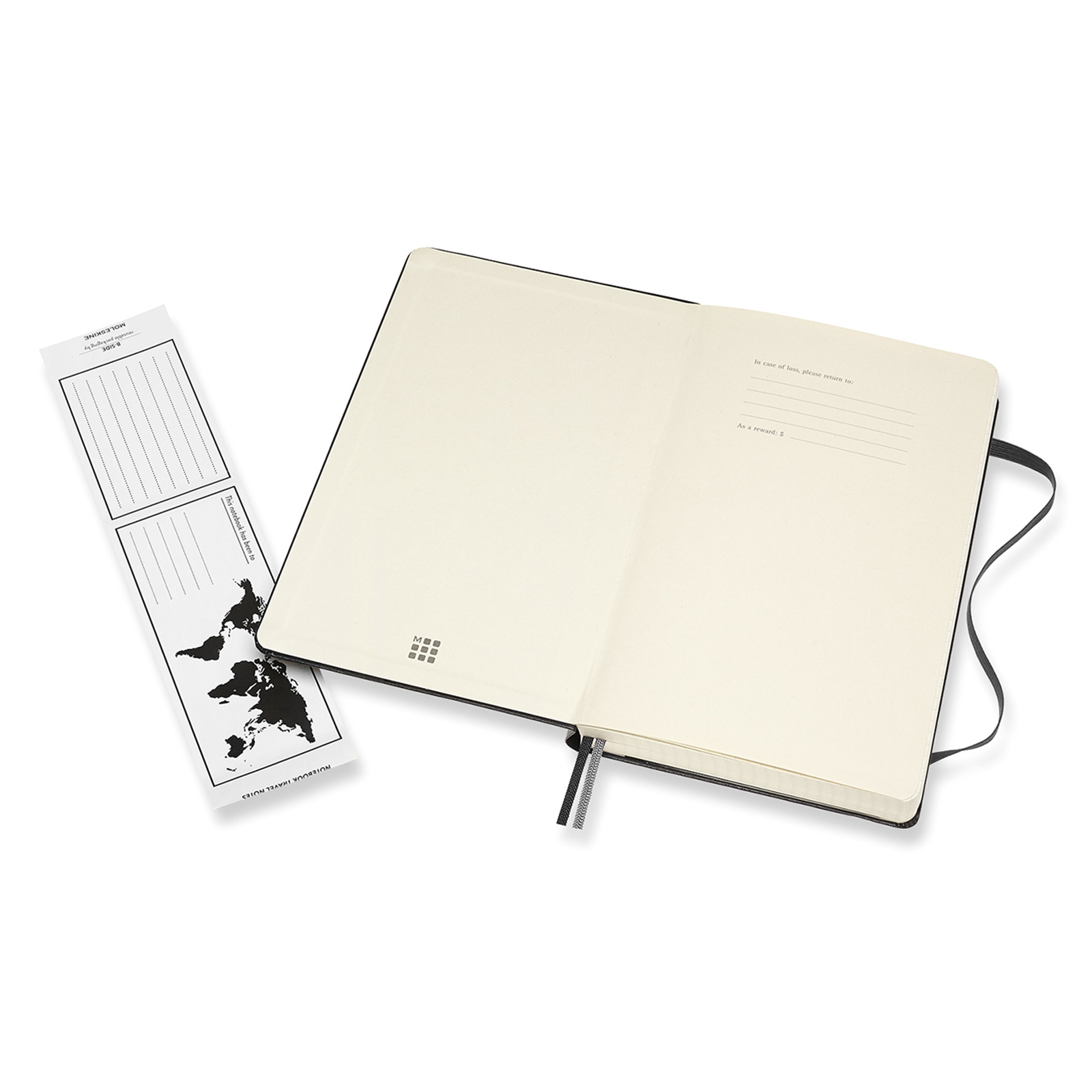 The Expanded Classic Notebook features Moleskine design elements, including rounded corners, an expandable inner pocket for loose notes gathered on the move, a matching elastic closure to protect your ideas, and the distinctive 'In case of loss' notice to record your contact details and a reward for anyone who finds your precious notes.
