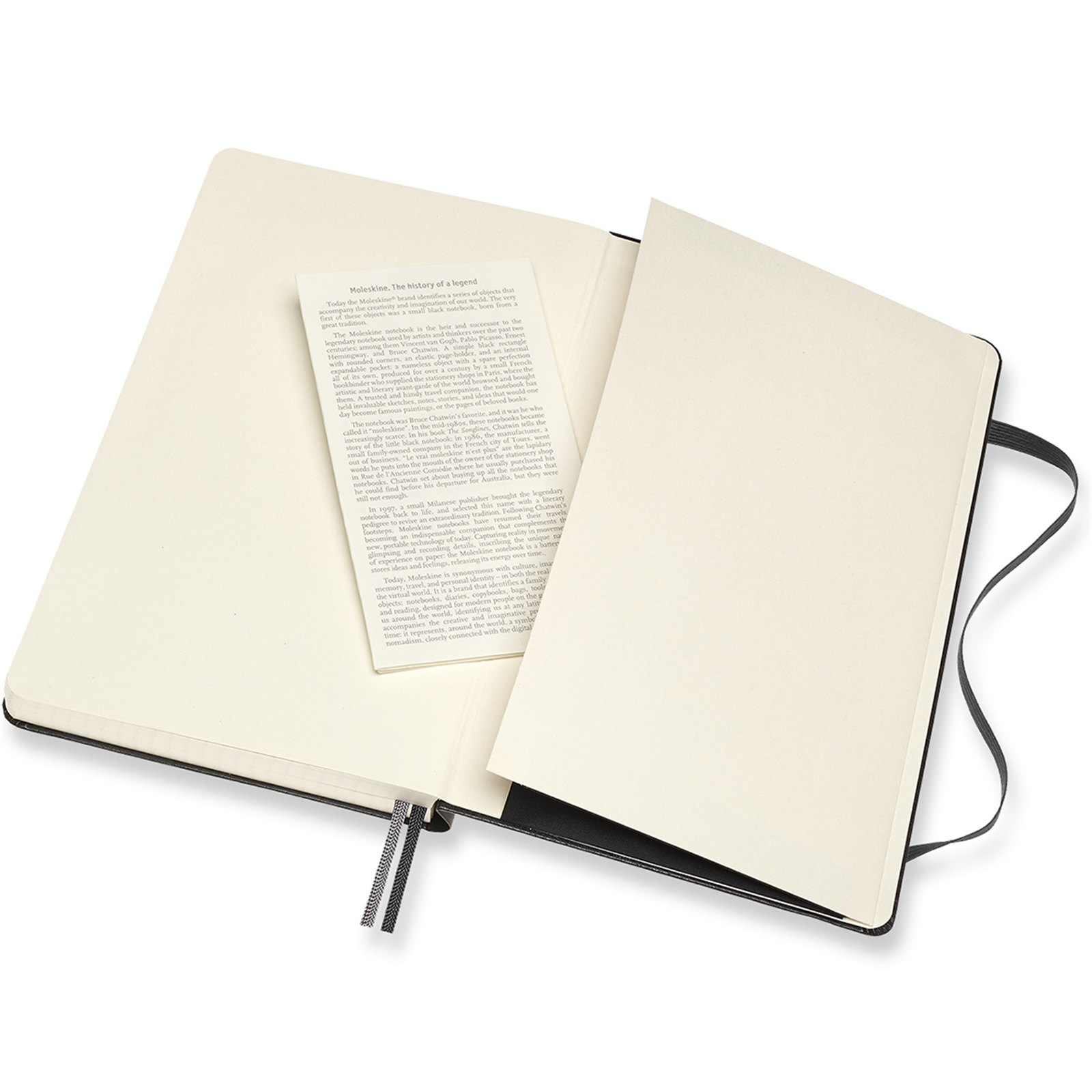 Features: Rounded corners, elastic closure and two ribbon bookmarks. Ivory-colored, 70gm, acid-free paper, 400 pages. Expandable inner pocket in the back. Lies flat, opens at 180 degrees. History of Moleskine is inside.