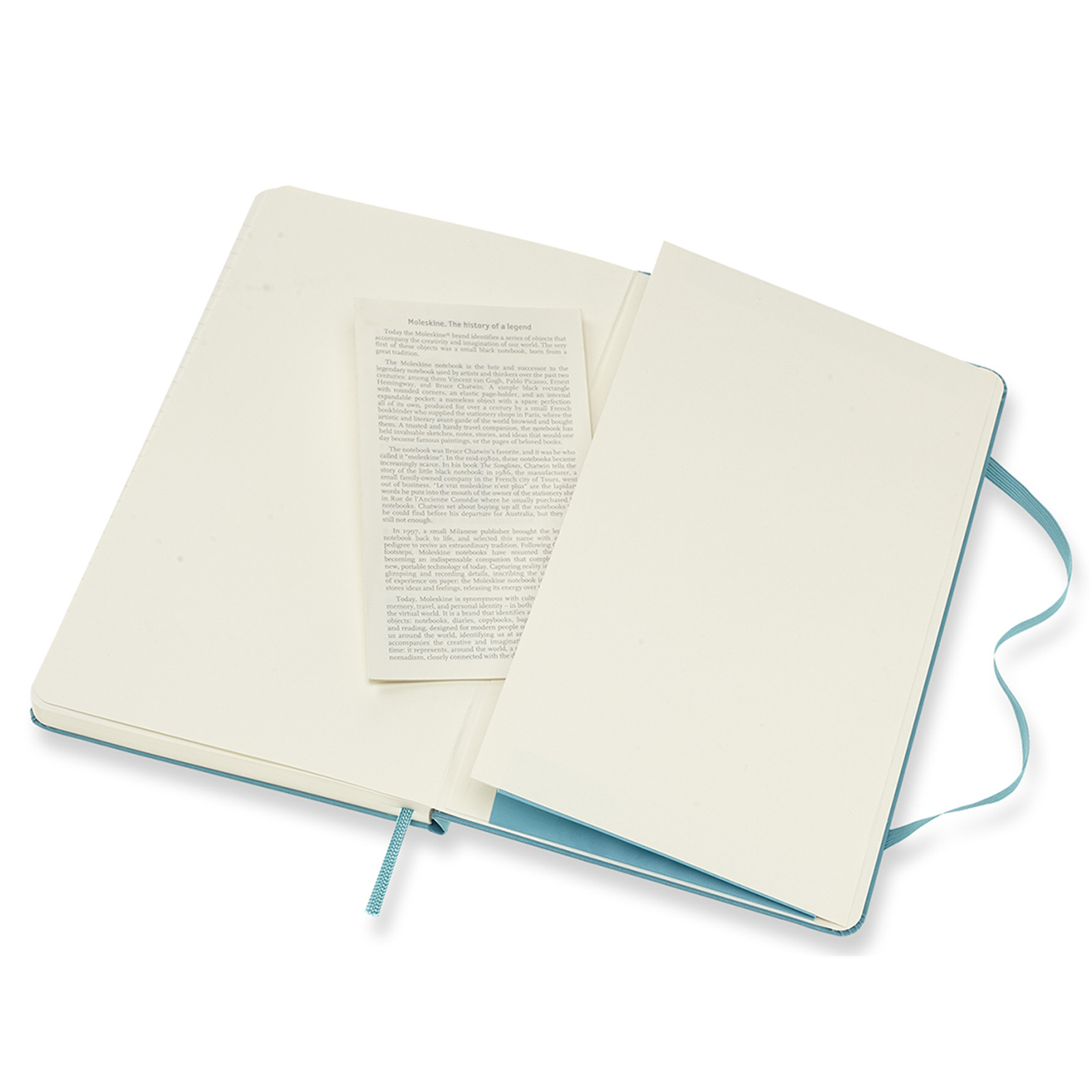 Rounded corners, elastic closure and matching ribbon bookmark. Ivory-colored, 70gm, acid-free paper. Expandable inner pocket in the back. Lies flat, opens at 180 degrees. History of Moleskine is inside.