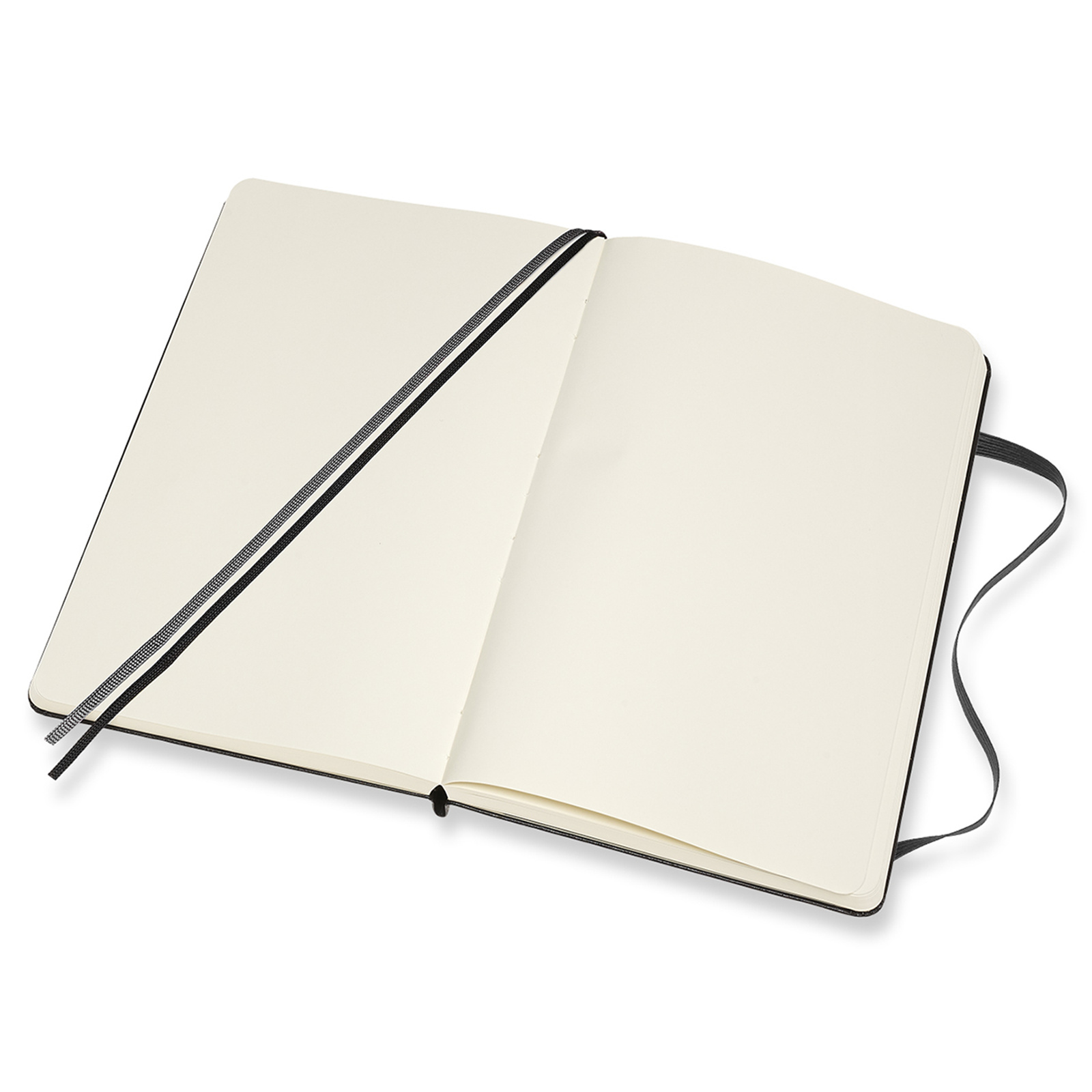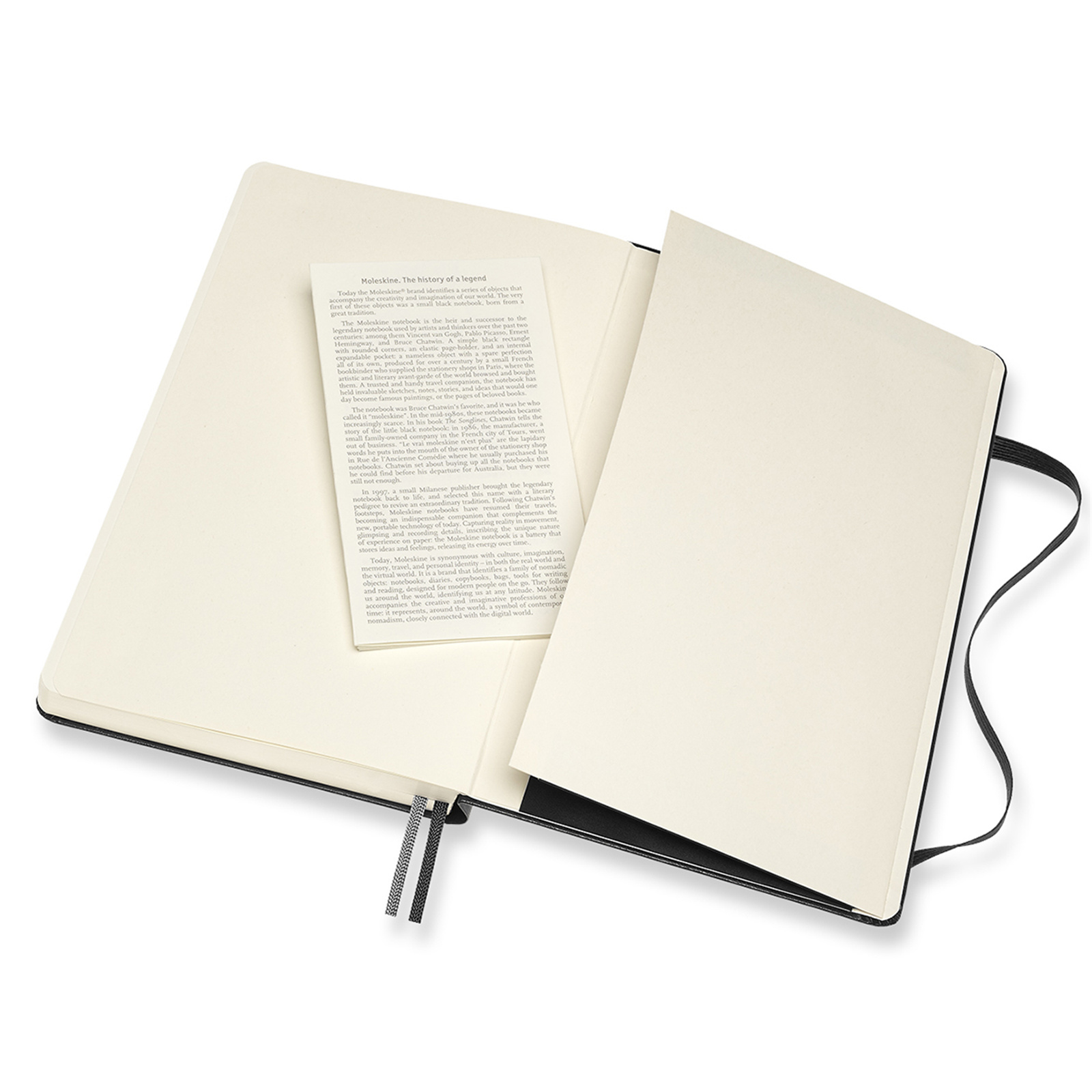 Features: Rounded corners, elastic closure and two ribbon bookmarks. Ivory-colored, 70gm, acid-free paper, 400 pages. Expandable inner pocket in the back. Lies flat, opens at 180 degrees. History of Moleskine is inside.