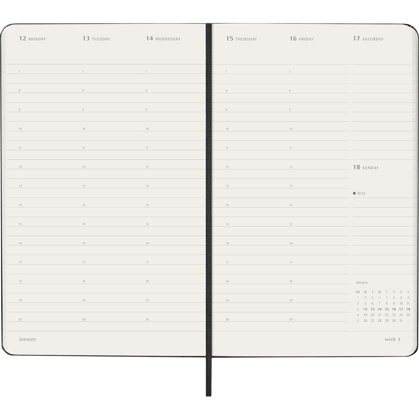 Rounded corners, elastic closure, and ribbon bookmark keep pages secure and provide quick access to your current week.