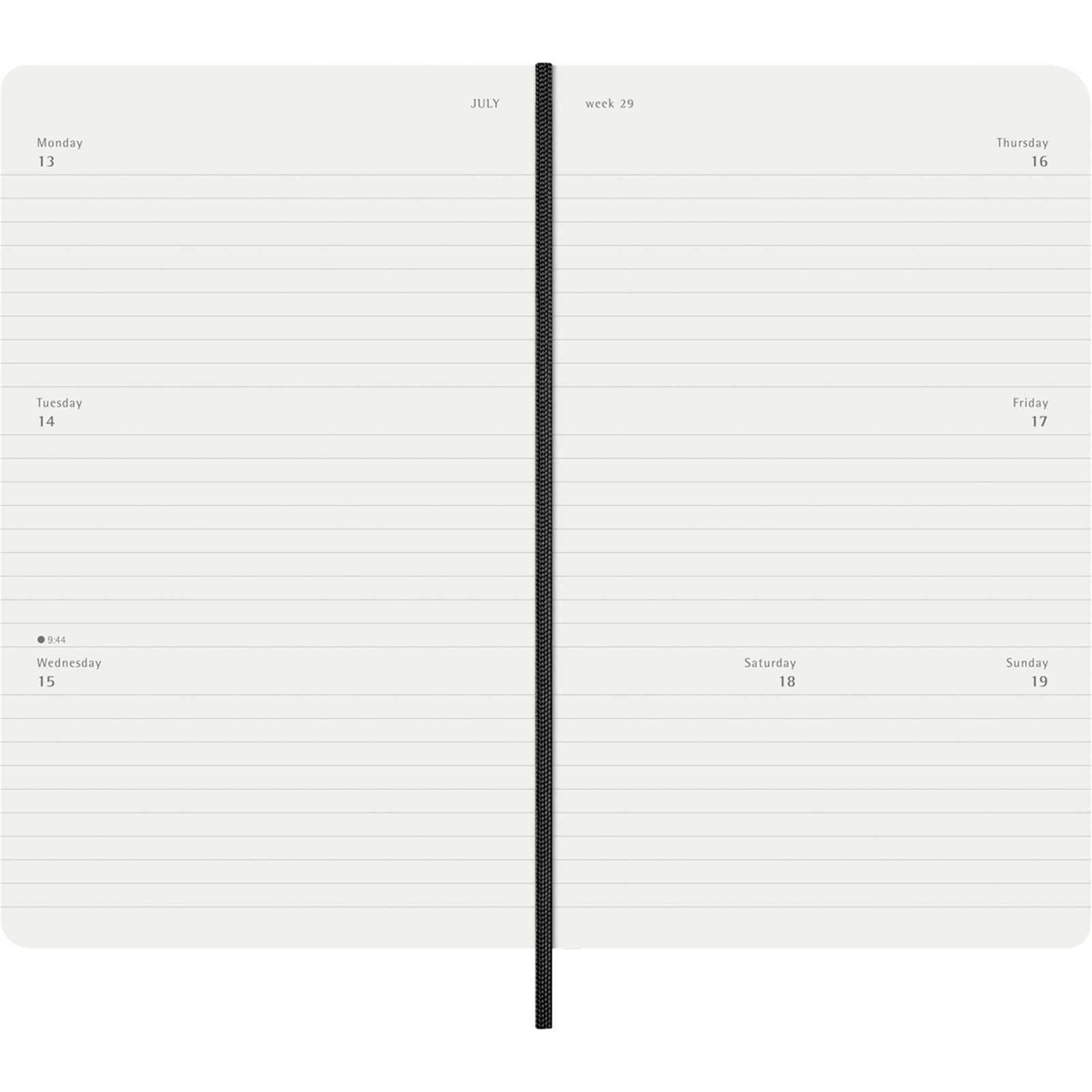 The Moleskine 12 Month Weekly Horizontal Soft Cover Large Diary in classic black is designed to be your compact companion for organizing your entire year, dated from January to December 2026. Its clever horizontal layout allows you to see your week at a glance, with Monday, Tuesday, and Wednesday displayed on the left page and Thursday, Friday, plus the combined Saturday/Sunday on the right. This design offers a clear and convenient overview of appointments and tasks, making it perfect for users who value week-by-week planning in a portable size.